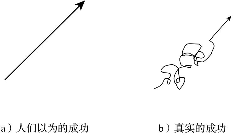人们以为的成功是一马平川的直线(见图1-3a),真实的成功却是一条九曲十八弯的折线(见图1-3b)。这九曲十八弯就是你绕不过去的反败历练。大大小小的反败成就创业的无限可能,很像唐僧师徒闯过九九八十一难后最终取得真经。