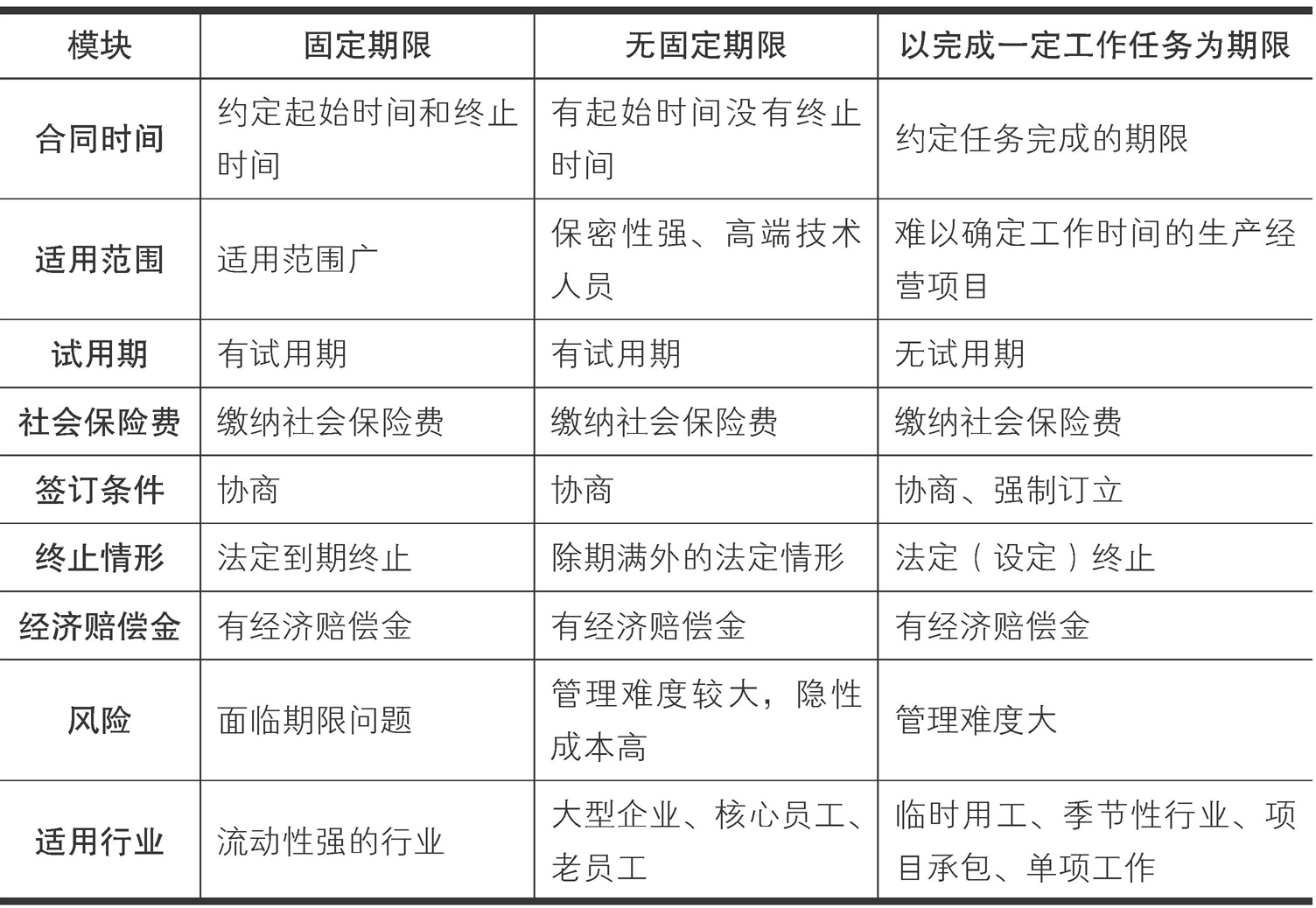 对于固定期限劳动合同、无固定期限劳动合同和以完成一定工作任务为期限的劳动合同的适用范围、签订条件、终止情形及选择策略的区别如表2-1所示。