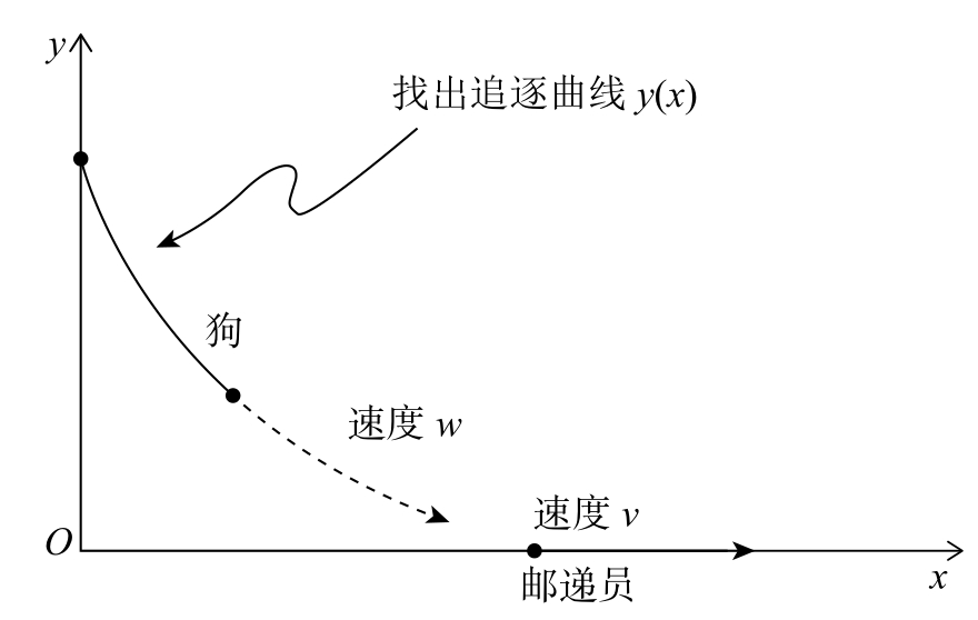 假设一个邮递员正在尝试摆脱一条追着他跑的狗。邮递员从原点 O 出发,然后以匀速 v 沿着直线跑。与此同时,那条狗从直线外的某一点出发,以匀速 w 跑向直线,到达直线后突然改变方向,使它总能直奔邮递员当前所在的位置,请列出这条狗的追逐曲线方程(见图2-1)。