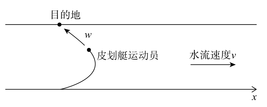 一个皮划艇运动员正在奋力划向对岸的某处。划皮划艇的人是那种目标坚定但头脑简单的人,总是直奔目的地,即使河流正把他冲向下游也是如此。假设河水水流速度是常数 v ,皮划艇运动员以相对于水流的常速 w 划行,请给出皮划艇的运动路径(见图2-2)。