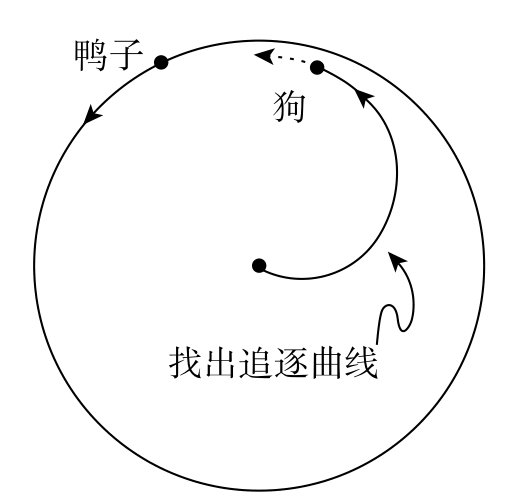 假设一条狗在一个圆形的池塘中间看见一只鸭子在围绕圆周游泳。狗为了追赶鸭子总是直接向它游去。换句话说,狗的速度向量总是与它和鸭子之间的连线有关。与此同时,鸭子以尽可能快的速度、按逆时针方向沿着池塘边游动以摆脱狗的追赶。假设这两种动物以相同的速度匀速游动,请列出狗游动路线的方程(见图2-3)。