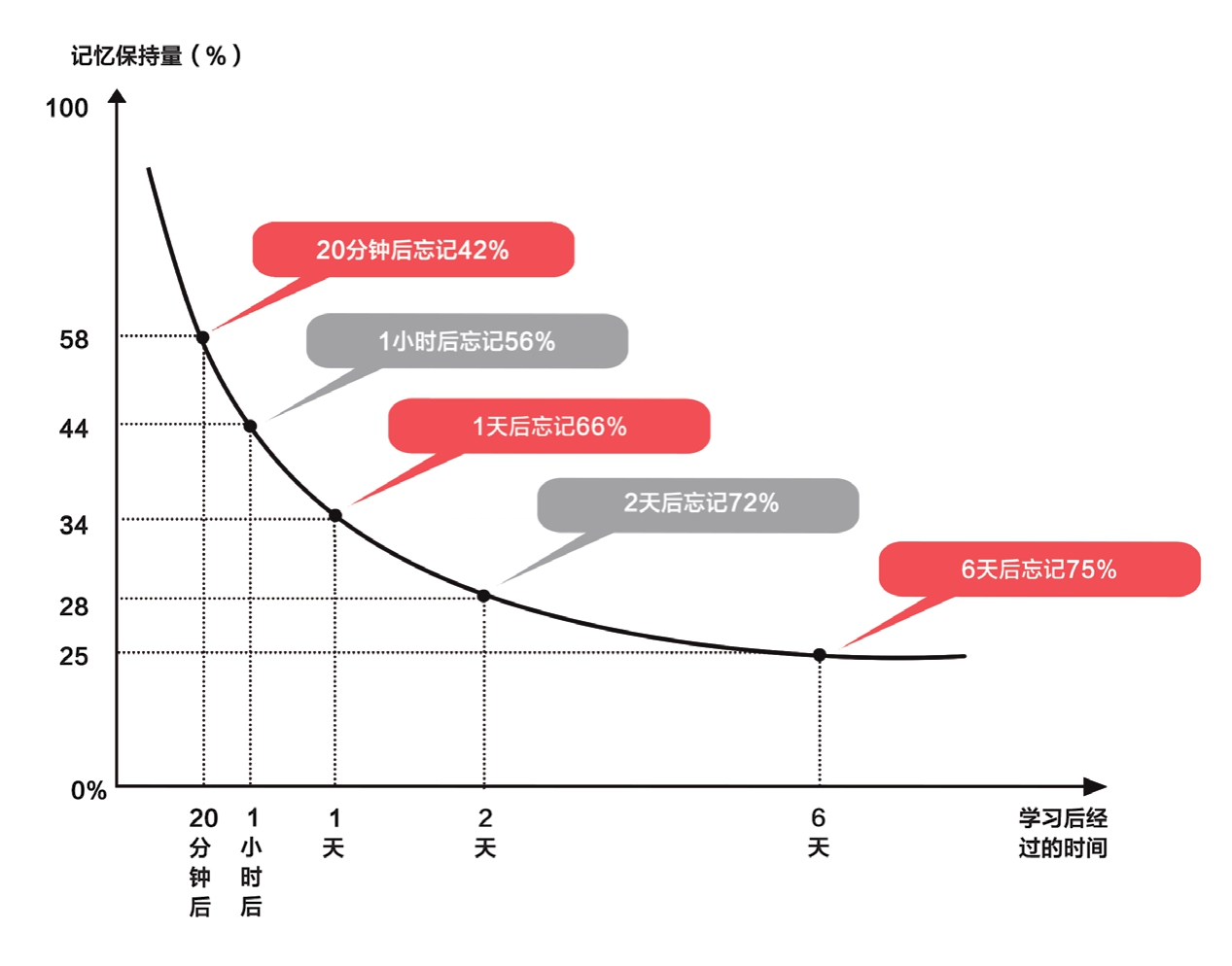 刚记住的内容在一小时过后平均只能保留44%不遗忘;两天后,这个保留比例会下降到28%。可以说,“记了就忘”是人类的普遍规律。为了更好地记忆,我们就需要不断温习、不断巩固大脑对新知识的记忆与理解。