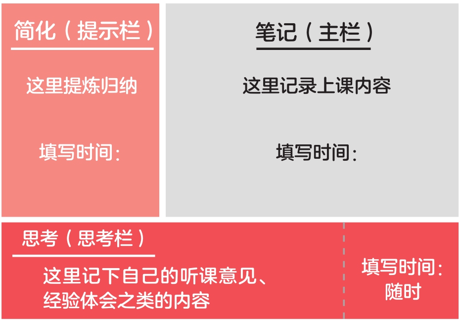 首先,将笔记本分成三个部分,我把这三个部分总结为“右大左小下长”。右边部分占整个页面70%的空间,叫作“主栏”;左边部分是“提示栏”,下边部分是“思考栏”,这两部分各占整个页面15%左右的空间。当然,大家也可以根据个人喜好,把纸面设置成“左大右小下长”。