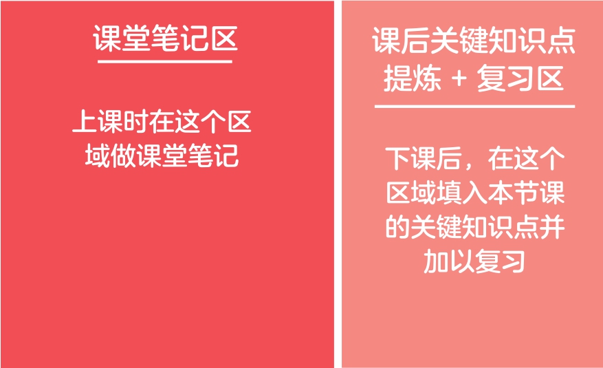 如果你觉得康奈尔笔记法有点复杂,或者没空做那么多步骤,还可以试试康奈尔笔记法的简化版——“关键知识点记录法”。这种方法把页面分成了左右两部分。我一般习惯把占页面80%的“课堂笔记区”放在左边,20%的“课后关键知识点提炼+复习区”放在右边。下面是这种方法的示意图和简单讲解。
