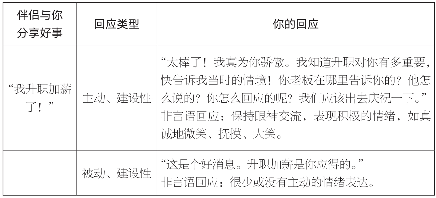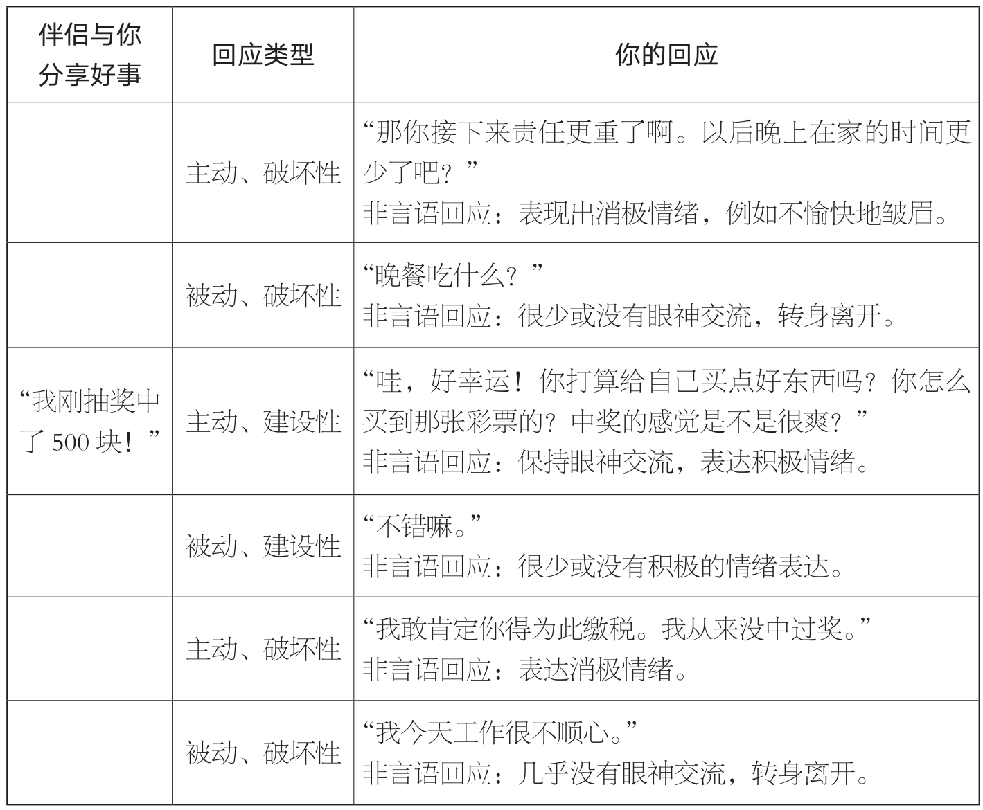 有一个奇怪的现象,婚姻咨询通常包括教导一对伴侣如何在婚姻中更好地斗争。这可能会把一段难以忍受的关系变成一段勉强可以忍受的关系。那也不算太差。然而,积极心理学更感兴趣的是如何把一段不错的关系变得更美好。加州大学圣巴巴拉分校心理学教授谢利·加贝尔(Shelly Gable)已经证明,一个人庆祝的方式比斗争方式更能预测亲密的关系。我们关心的人经常告诉我们他们的胜利、成功,以及发生在他们身上的不那么重要的好事。我们的应对方式可以加强这种关系,也可以破坏它。下表列出了四种基本的应对方式,其中只有一种有助于建立良好关系。