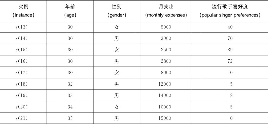 下面我们举一个例子,看看CART回归树的构建过程。假设有如表2.11所示的一个数据集,描述了几个不同年龄的人的性别和月支出情况,以及他们对流行歌手的喜好度(0~100的数值)。利用CART回归树建立决策树模型,并预测如果一个人26岁、男、月支出3000,那么他对流行歌手的喜好度应该是多少。