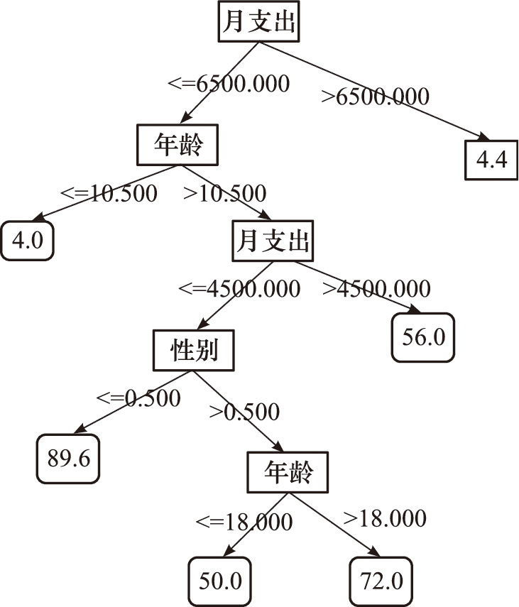 比较以上对年龄、性别和月支出特征的计算,我们选取平方误差最小的特征——分割点对(j,s),即“月支出,6500.0”。由此将数据集分割为两区域R 1 和R 2 :