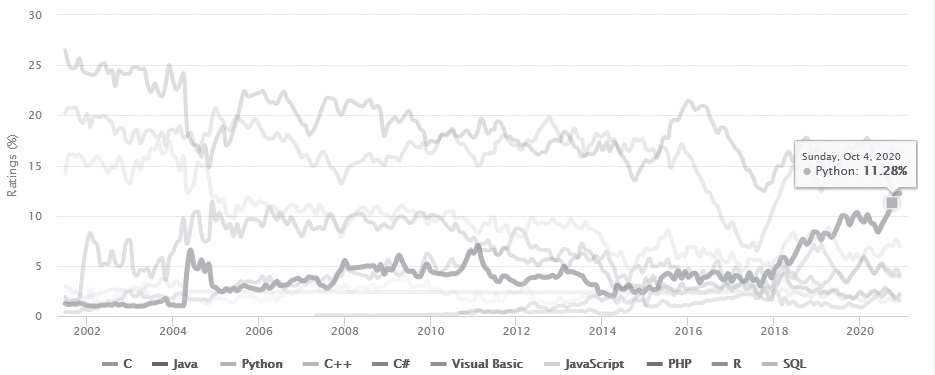 虽然Python至今为止已经有30多年的历史,甚至比Java的诞生还早,前期却默默无闻,直到最近的10年才飞速发展,开始在各个领域内大显身手。Python在2020年12月的TIOBE编程语言排行榜中位列第三,超过了C++,如图1-3所示。