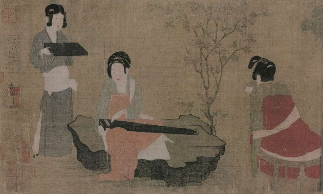 图中描绘了唐代宫廷贵妇赏琴品茗的雅致生活。抚琴者坐在磐石上,调弄琴弦的动作刻画得细致入微。品茗者虽然只有背影,但也能感受到她雍容自若,细细体味。琴与茶同在一幅画中,可以看出二者在当时的贵族文化生活中已有相当重要的地位,同时也可以看出人们很早就意识到琴和茶的共通。