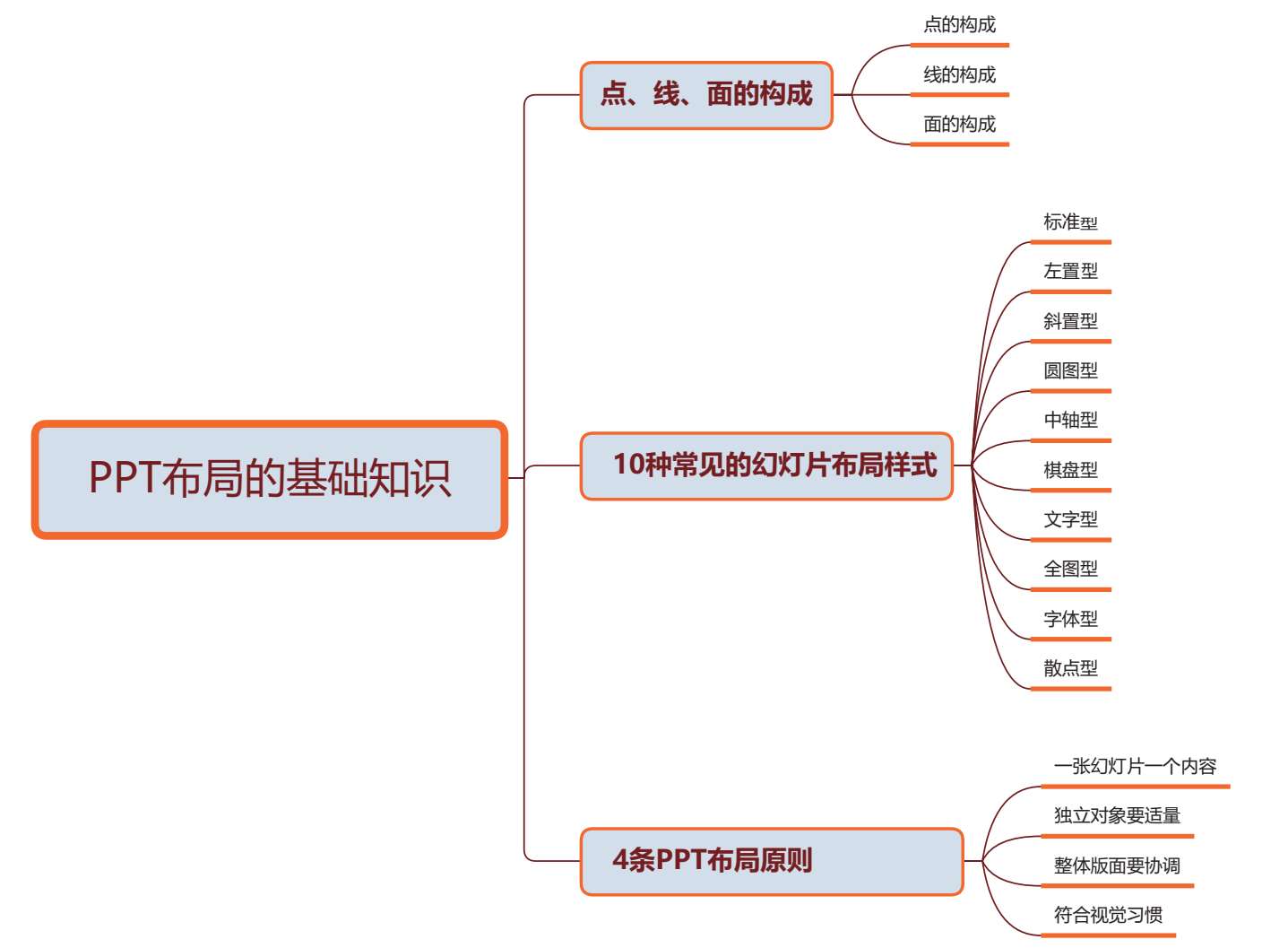 一个PPT成功与否,布局很关键,首先必须了解PPT布局方面的知识。懂得点、线、面构成的基础知识,参考 10 种常见的幻灯片布局样式,了解基础的PPT布局原则,才能做出优秀的PPT。本节具体知识框架如下图所示。