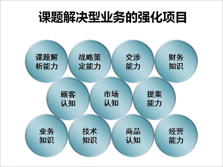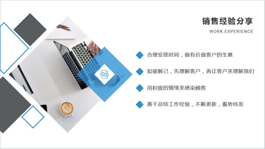 点是构成PPT的基本单位,在PPT设计中,经常需要主观地加一些点。最常用的可能就是对并列关系的内容添加项目符号。如下图所示,在每条销售经验之前加个菱形。这些点在页面中就起到了活泼生动的作用。特别地,在这个页面中还根据项目符号的形状添加了左侧的多种菱形对象,如形状、图片、图标等,形成面的多种效果,使页面更加丰富。因此,只要使用得当,有些点甚至可以起到画龙点睛的作用。