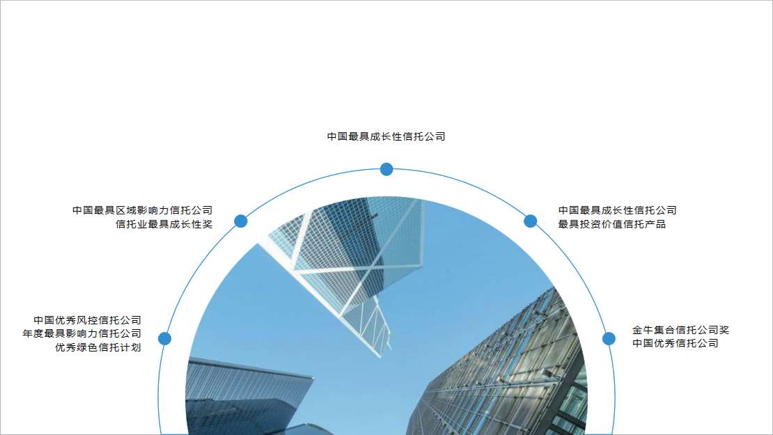 将幻灯片进行圆图型布局时,应该用正圆或半圆构成版面的中心,在此基础上按照标准型的布局样式安排标题、说明文字和标志图形,如下图所示。