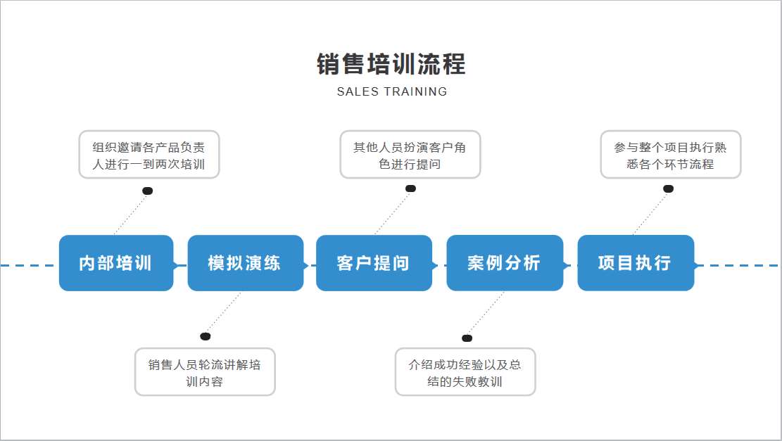下图所示为销售培训流程,整个流程横向排列,能够非常清晰地显示各个环节的先后关系。