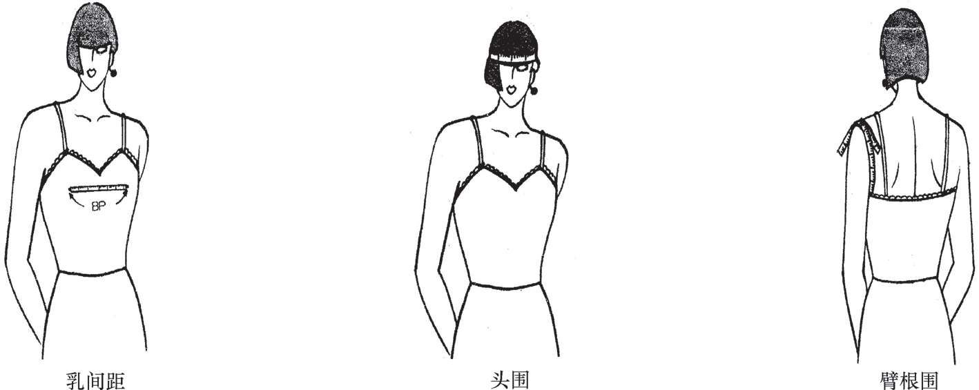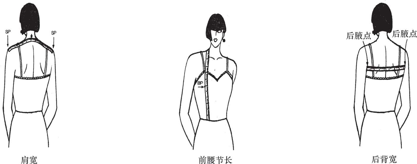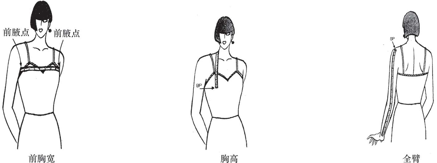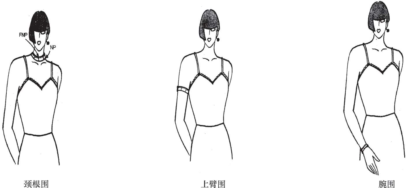 (10)定点测量:测量时要通过基准点或基准线,例如,测量胸围时,软尺应水平通过胸高点(BP),测手臂长时应通过肩点、肘点和腕骨突点。