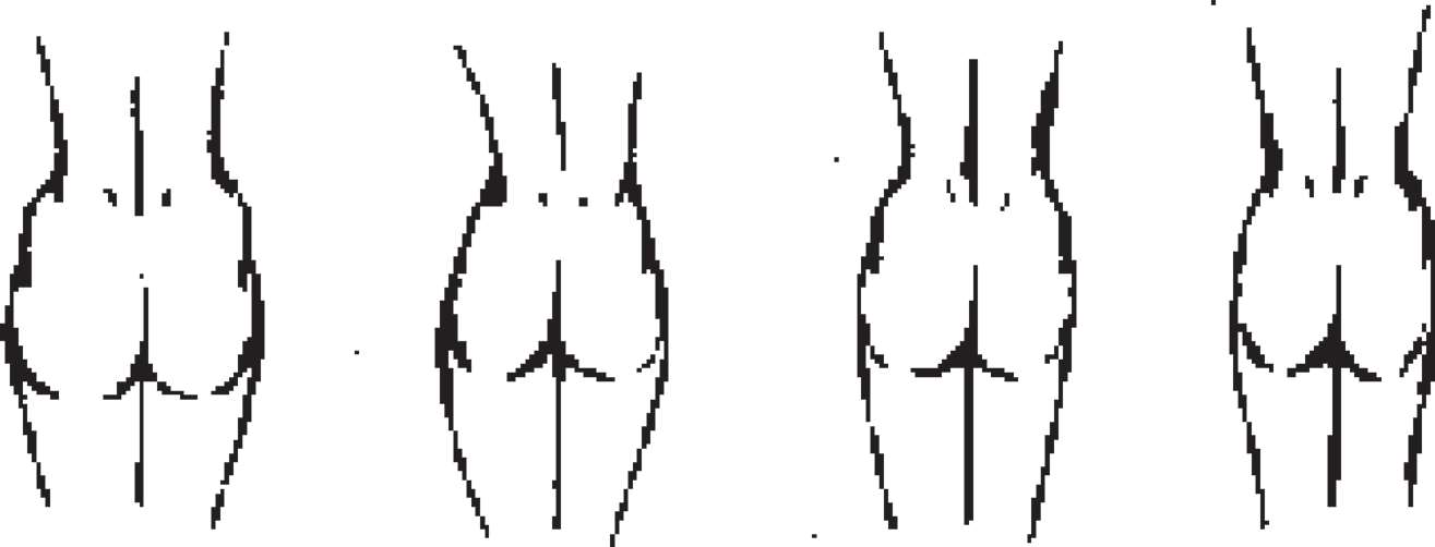 (6)臀部。从后面观察臀部:六角形、三角形、椭圆形、直筒形(图2-7);从侧面观察臀部:扁平形、下垂形、标准形、后翘高挺形。