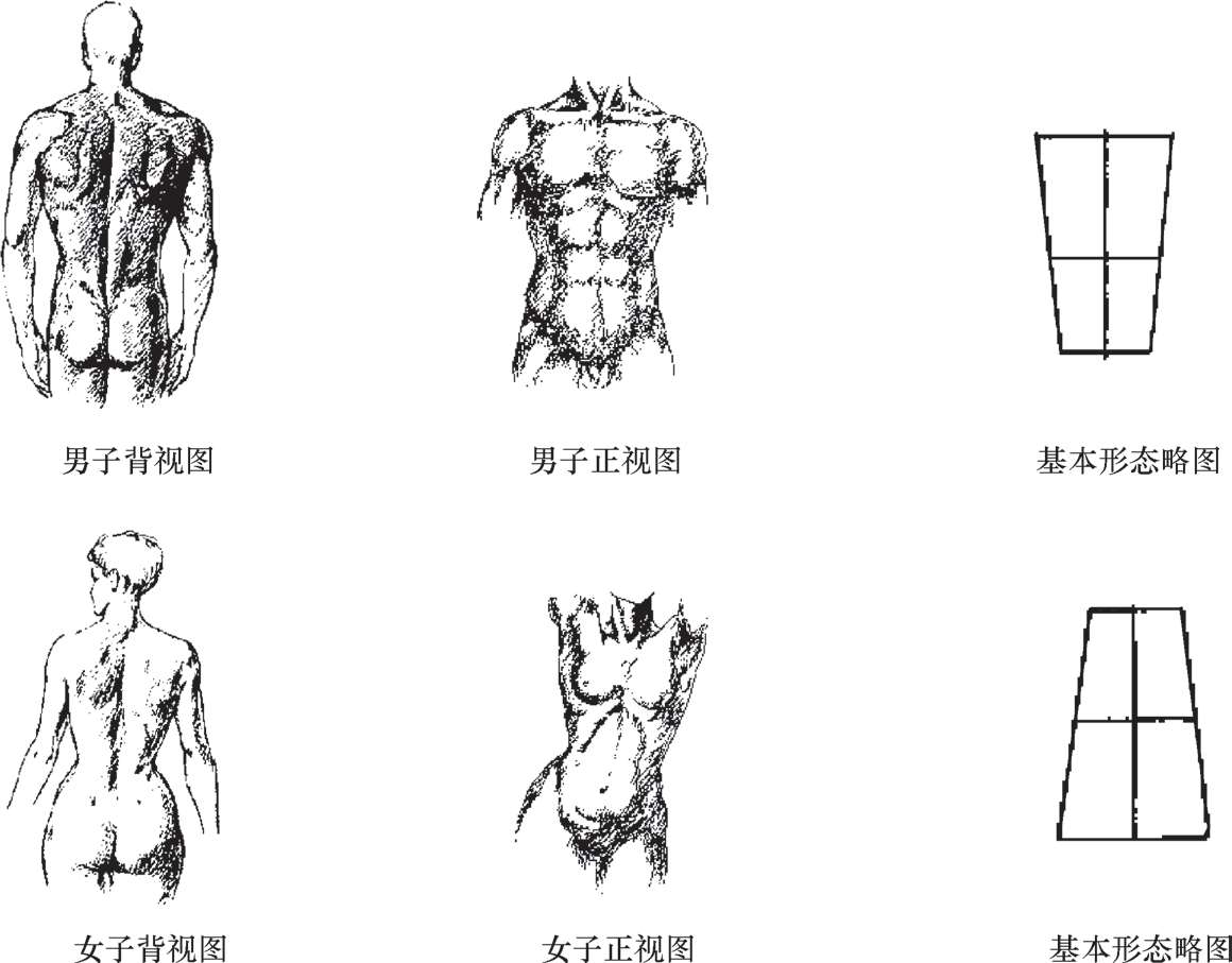 从人体横断面的角度来看:男性胸廓宽厚,骨盆窄且方;女性胸廓扁窄,但乳房突出,腰围纤细,骨盆扁宽。一般男性肩宽比臀宽大14~16cm,而女性肩宽比臀宽只大2~5cm。了解这些有助于表达性别区分性明显的合体型服装。