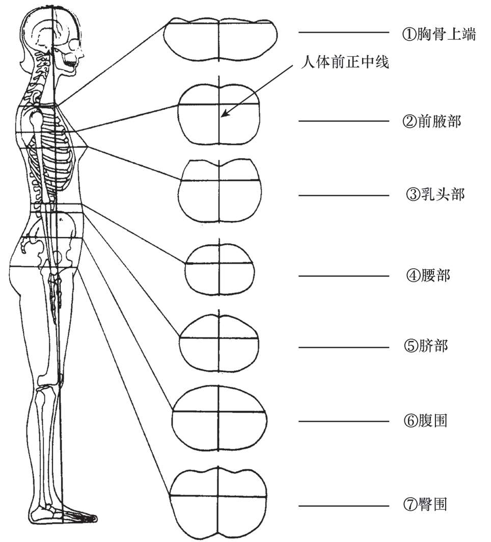 (2)女性胸部呈凸起状,乳峰位显著而且相对受胸衣影响较大。胸部截面为偏正方形。