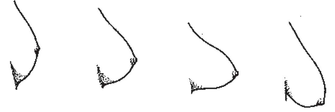 (3)乳房。从侧面观察乳房:圆盘形、半球形、圆锥形、下垂形(图2-6);从乳沟宽度可分为:宽形、窄形。