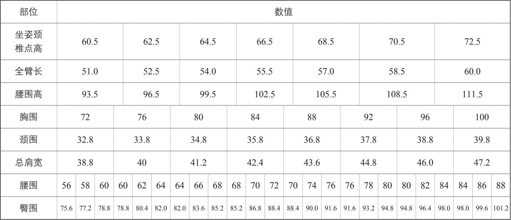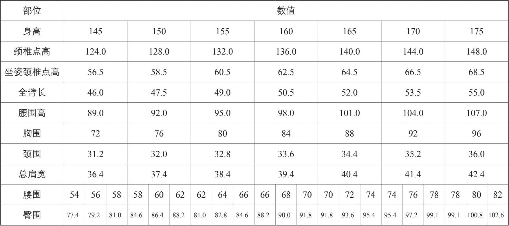 详细的内容请查阅《服装号型 儿童》(GB/T 1335.3—2009)、《服装术语》(GB/T 15557—2008)、《服装用人体测量的尺寸定义与方法》(GB/T 16160—2017)等。表2-6所示为日本女子尺寸参考数据。