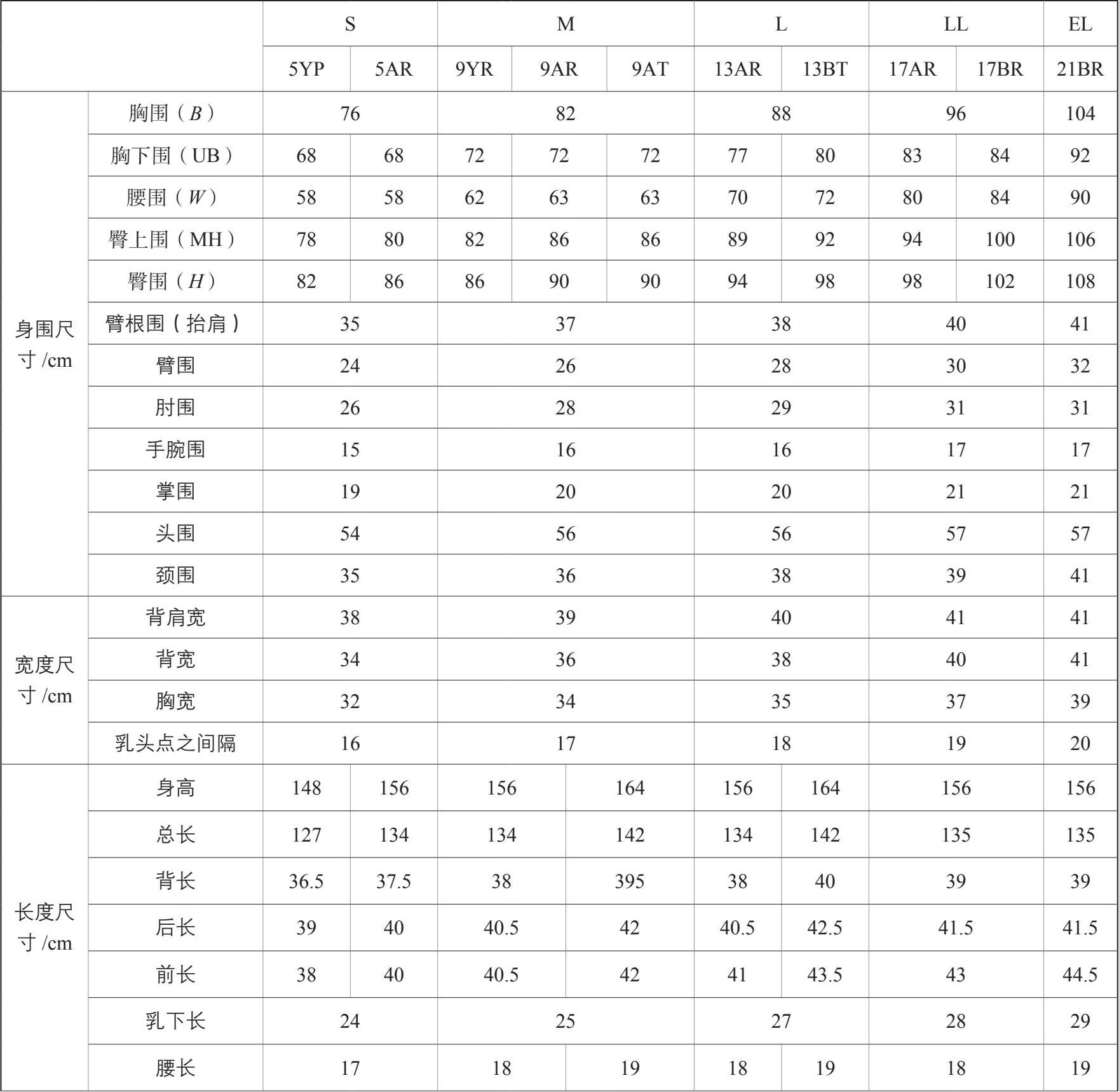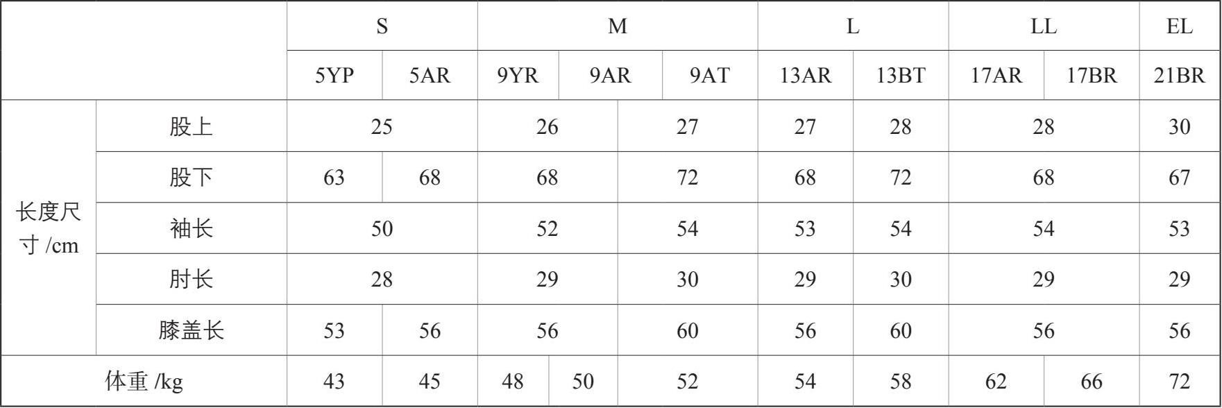 [该尺寸是根据日本文化服装学院的计测资料和日本工业规格(JIS)的人体尺寸,从多方面加以研究计算出来的,可作为尺寸设置的参考。]