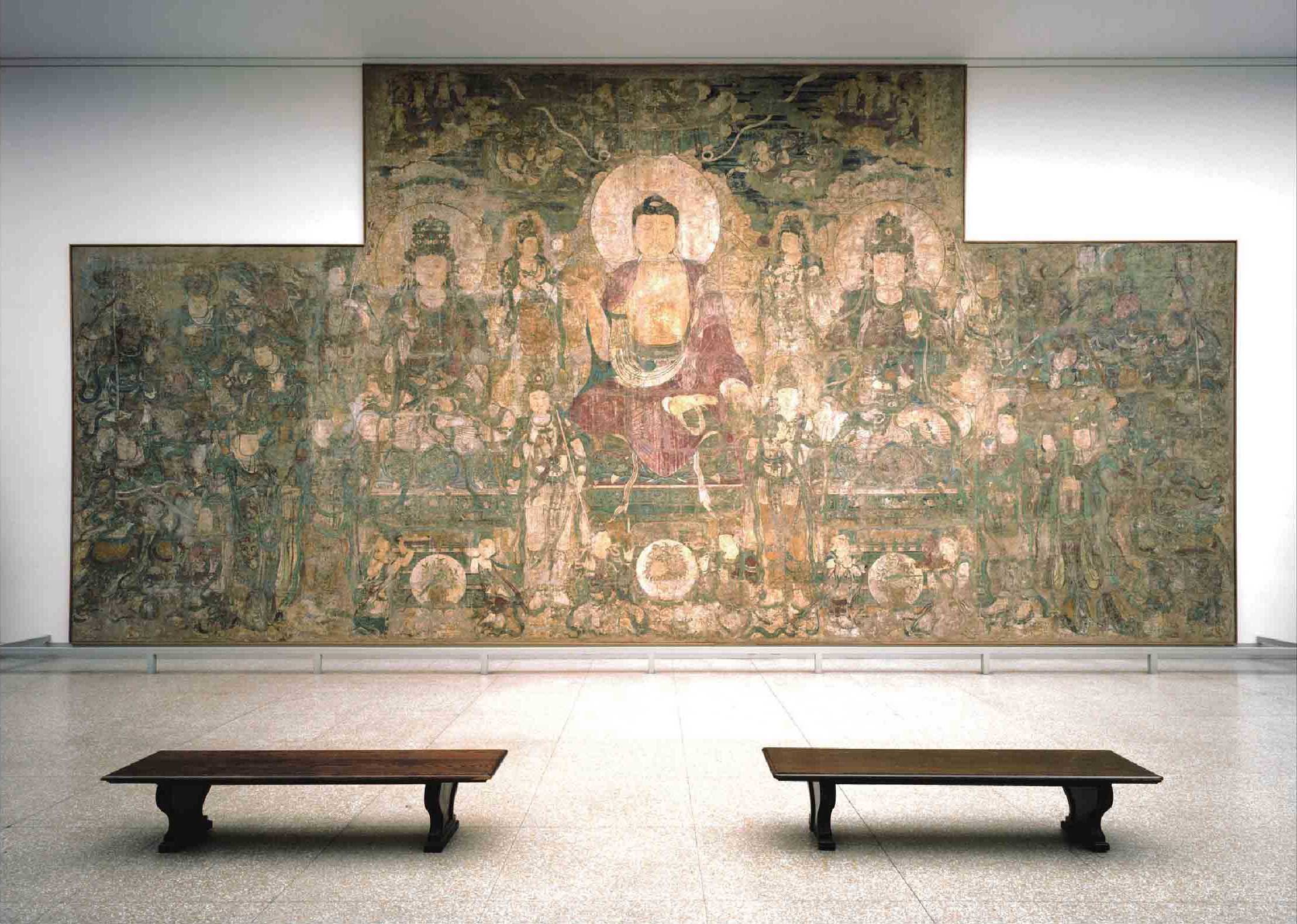 佛教教义中提及的对身体和精神的治疗方法为其在亚洲的广泛传播起到了重要作用。汉传佛教中,将婆娑世界本师释迦牟尼佛、东方净琉璃世界药师佛与西方极乐世界阿弥陀佛合称为“三宝佛”,他们在佛教造像中往往同时出现。药师佛的形象一般头为螺发形,左手持药壶,右手结施无畏印。这幅壁画表现了一场法会情景,药师佛身着红色长袍,众多佛菩萨参加,其中包括呈坐姿的日光菩萨和月光菩萨。另有12位罗汉,每边6个,象征着佛陀济世活人的誓言。宏大的场面、完整的形象及进深很浅的画面空间,被普遍认为是14世纪初的著名画家朱好古的风格。