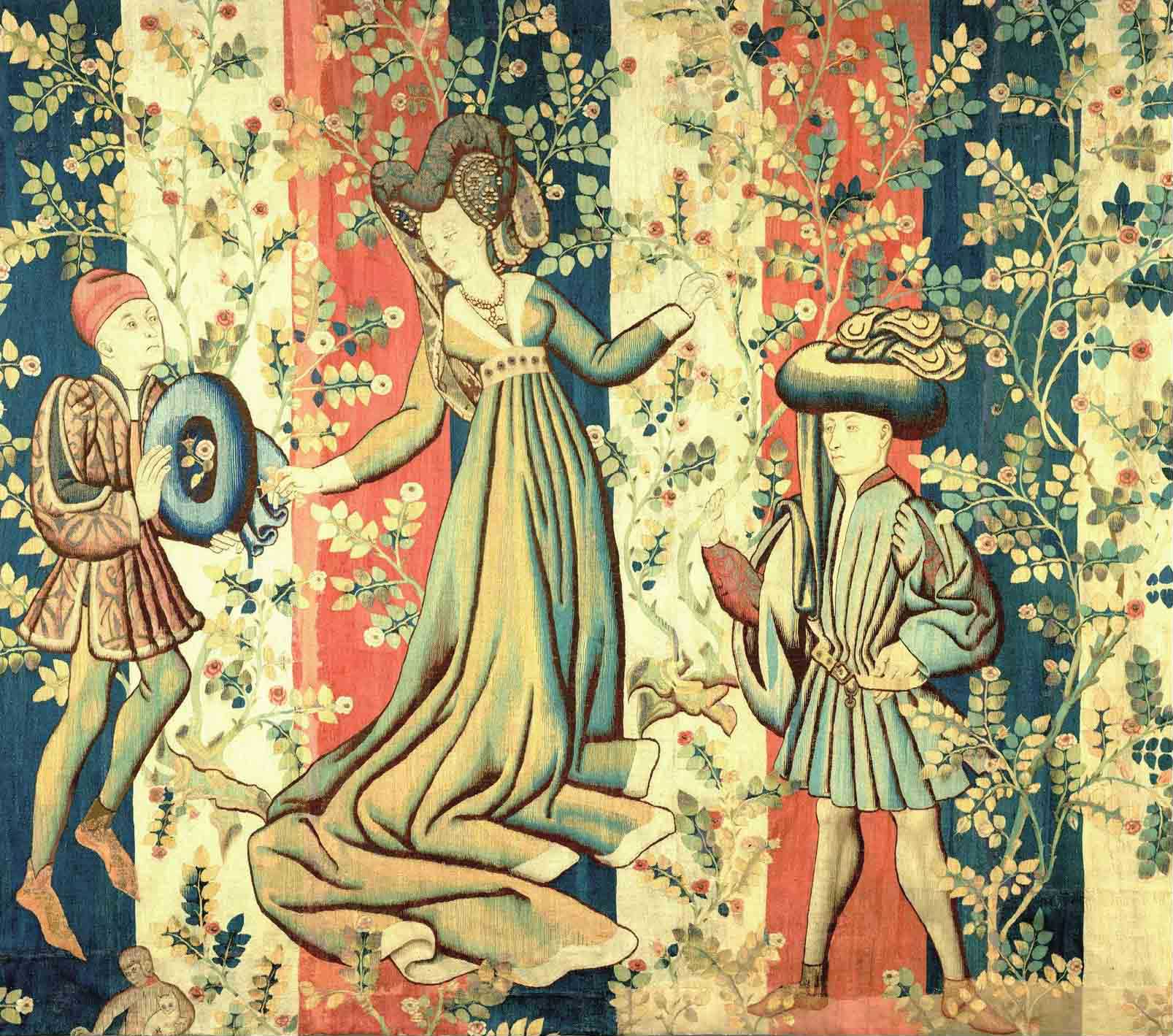 这种挂毯在中世纪时常常起到壁纸的作用,人们会用一整套挂毯覆满房间的墙壁,因而在中世纪的文献中,挂毯常常被称为“房间”(chambres)。这套以白色、红色、绿色为主,装饰着玫瑰树的挂毯,很可能是为法国国王查理七世(Charles Ⅶ)制作的。挂毯上精致华丽的金属丝线不仅被用于装饰朝臣和女士所穿戴的衣物、珠宝,甚至在背景的叶片和盛开的玫瑰花中都被用到。通过全尺寸着色设计,编织者将金属纬线压紧,直至完全看不到未着色的羊毛经线。即使有多架织机、多名织工同时作业,制作这样一套挂毯往往也需要耗费数年时间。用挂毯装饰墙壁,不仅起到防潮的功用,更能彰显房屋主人的财富与品位。