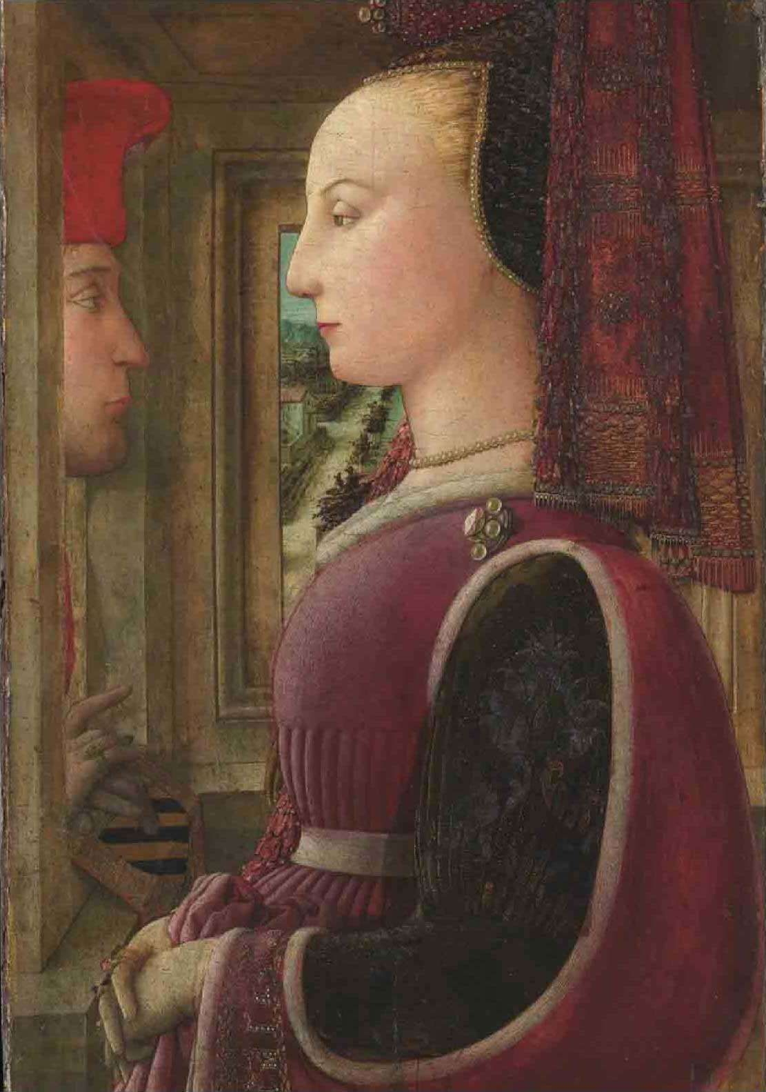 菲利普·利皮修士是文艺复兴前期意大利最重要的艺术家之一。这件作品是现存最早的意大利双人肖像画,它是第一件将模特绘于家庭环境中的画作,也是首次在肖像画中表现窗外风景。这位女士穿着奢华的法式服装,袖子上绣着“忠诚”(Iealta)字样,正被一位从窗口探进头来的男子注视着。男子很可能就是她的未婚夫,他的双手放在一个清晰的徽章上。这两位可能是洛伦佐·迪·拉涅里·斯科拉里(Lorenzo di Ranieri Scolari)与安焦拉·迪·贝尔纳多·萨皮蒂(Angiola di Bernardo Sapiti),他们于1439年左右结婚。利皮的工作因意大利人偏爱侧面像而变得复杂起来,这比阿尔卑斯山以北地区流行的四分之三视角画起来要困难得多。