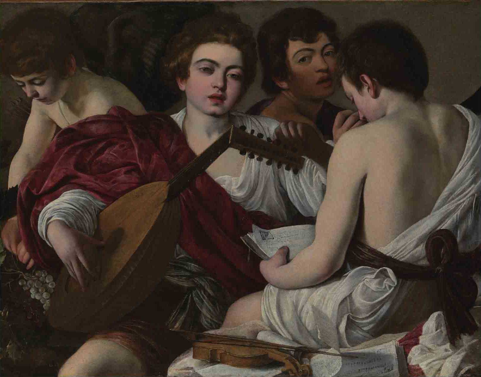 卡拉瓦乔是17世纪初最重要的意大利艺术家。他擅长通过近距离的观看视角、戏剧性的光影关系来组织画面。这种手法是其最主要的一种风格元素,阴影变得更暗,明亮的光线贯串主题。卡拉瓦乔生动地表现出关键的时刻和场景,内容往往是暴力、斗争、酷刑和死亡,其作品对巴洛克风格产生了深远的影响。尽管被同时代人称为“音乐作品”,但这幅画在描绘音乐表演的同时,通过丘比特的形象,暗示出寓言的意义。人物所穿的服装是一种不太明确的古典风格,画面右侧第二个男孩据说是卡拉瓦乔的自画像。画家自幼在伦巴第(Lombardia)接受绘画训练,初到罗马后以半身肖像而闻名,这件作品就是为他的第一位伟大赞助人、枢机主教弗兰切斯科·德尔·蒙特(Francesco del Monte)绘制的。