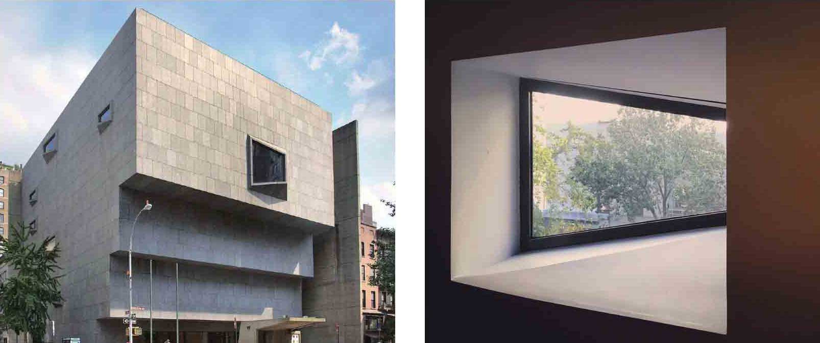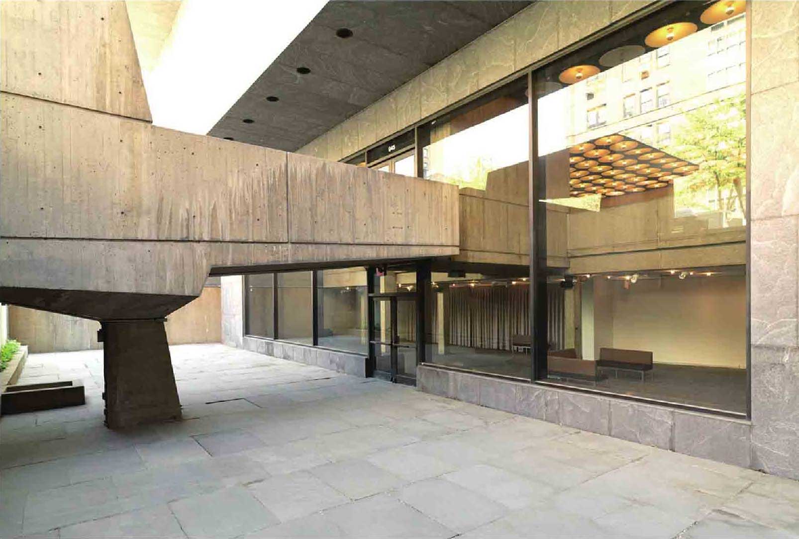 在位于第75街与麦迪逊大街拐角处的这座独立建筑中,布劳耶创造出一种使人与艺术亲密接触的参观体验。灰色的花岗岩墙壁上点缀着不对称的、造型独特的窗户,从外面几乎无法看到内部的任何活动。从麦迪逊大街进入博物馆是一个缓慢的过程,自一个低矮的混凝土雨棚开始,经过下沉花园,才能进入宏伟的标志性大厅。布劳耶希望帮助游客从拥挤的麦迪逊大街过渡到与艺术深入接触的展厅。当时惠特尼博物馆对灵活展览空间的需求使得现在的场馆仍保有大型开放的展厅。预制混凝土板、开放式的天花板设计允许墙板移动,并且能为每一个新的展览空间提供照明。手工制作的楼梯和抛光的青铜饰面贯穿整个建筑,体现了布劳耶对建筑复杂性和艺术性的思考。