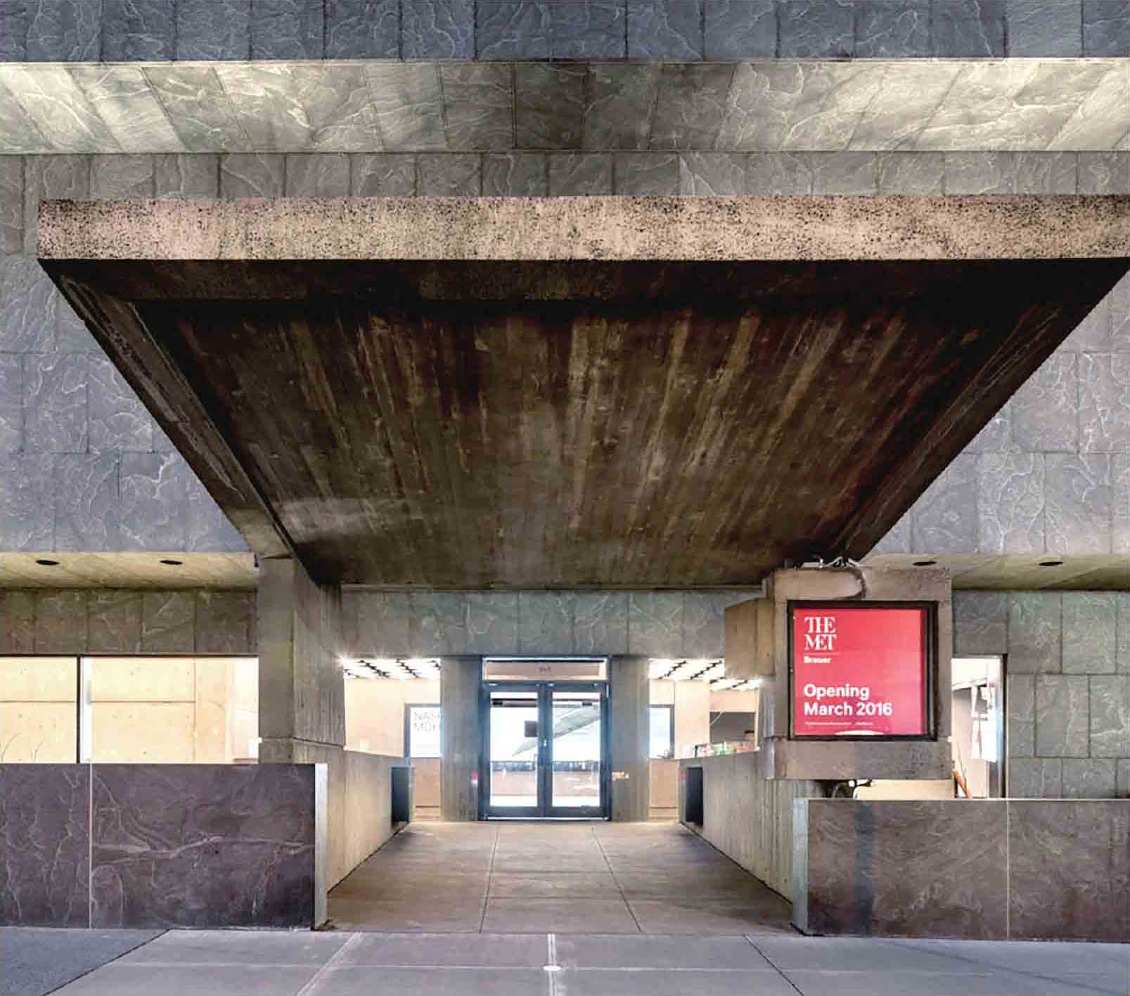 2016年3月18日,大都会艺术博物馆增设了布劳耶馆,这是一个专门展示现当代艺术的新空间。该展馆所依托的建筑是著名包豪斯(Bauhaus)建筑师马塞尔·布劳耶(Marcel Breuer)的代表作之一。1963年,布劳耶接受了在纽约建造一座新的美国艺术博物馆的崇高使命,这标志着对20世纪美国建筑发展具有决定性意义的几十年自此开始。不同于当时充斥着整个曼哈顿的那种以玻璃和钢铁为主结构的商业建筑,布劳耶所擅长的、来自欧洲建筑的混凝土结构令人眼前一亮。他主持建造的这座博物馆(即当时的惠特尼美国艺术博物馆)像一座活生生的纪念碑,与当时盛行的、转瞬即逝的建筑潮流趋势形成鲜明的对比。布劳耶相信,上东区散乱的上流社会私宅,不久将被新型办公大楼熠熠闪光的天际线取代,而博物馆将是一个坚实而永久的艺术品贮存地,且其自身也是一件艺术品。