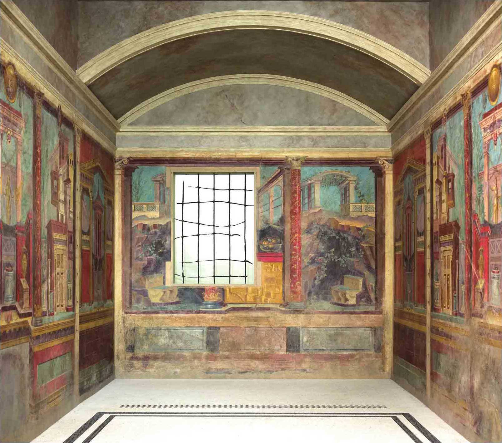 这是一间来自P.法尼乌斯·西尼斯特(P.Fannius Synistor)别墅的复原卧室。该别墅位于博斯科雷亚莱(Boscoreale),由于79年维苏威火山喷发而被埋葬。开着窗的墙壁上描绘的是户外的场景,上方有围栏和凉亭,下方则有石窟或洞穴,怪石嶙峋的岩洞内有一处喷泉,下面是一个小小的赫凯特(Hekate)身影;墙壁中央则有单色景观护栏,护栏上放着装满水果的玻璃碗。两侧墙壁对称,各自被壁柱细分为四个部分,界定出摆放床榻的位置。在其描绘的封闭庭院中,我们可以看到雕像、圆形建筑以及顶部覆满植被的高塔。这些装饰元素与带有柱廊和突出露台的建筑及城市景观相交替。