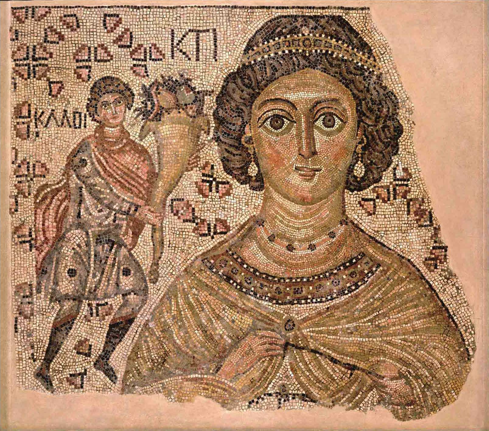镶嵌画(mosaic)是由彩色玻璃、石头或其他材料拼合而成的艺术品或图像,常用于建筑物的室内外装饰。拜占庭帝国的镶嵌画兴盛于6世纪至15世纪,大多数都毁于战争,仅有为数不多的残片存世。画面中佩戴着珠宝的女子拿着罗马的测量工具,根据修复后的希腊文“Ktisis”来判断,她是慷慨和赠予的拟人化形象;身旁的男子捧着盛满鲜花、水果和谷物的羊角,象征着丰饶。在女子两侧原本应当有相对的两个人物,现存的男子头上用希腊文写着“好”,另一侧很可能写着“祝福”。这幅镶嵌画残片由大理石和小块玻璃拼嵌而成,具有典型的500年左右的拜占庭风格。大都会艺术博物馆分别收购以上两件人物残片后,根据经销商所拍摄的照片复原了这件作品。