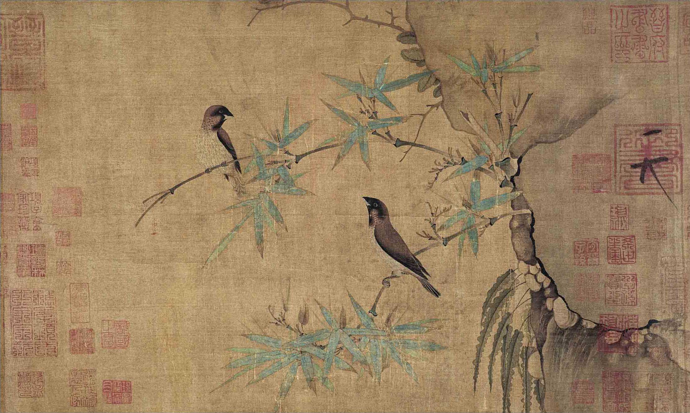 宋徽宗赵佶诗词书画皆精,自创的“瘦金书”字体对后世书法影响颇大,“天下一人”花押也是历史上最独特的花押之一。《竹禽图》绘石崖伸出两根竹枝,两禽鸟相对栖于枝上,用笔细腻工整,竹子的枝叶、棘条都用色敷染而不勾勒,崖石的画法可见生拙之笔。这件作品体现了院体风格的写实性,竹草崖石用写意的方法处理,两小鸟用工笔画的方法绘制。粗细互助,显示了徽宗绘画技艺的高妙。卷后有皇室后裔赵孟的题跋:“道君聪明,天纵其于绘事,尤极神妙。动植物无不曲尽其性,殆若天地生成,非人力所能及。此卷不用描墨,粉彩自然,宜为世宝。然丛尔小禽蒙圣人所录,抑何幸耶。”