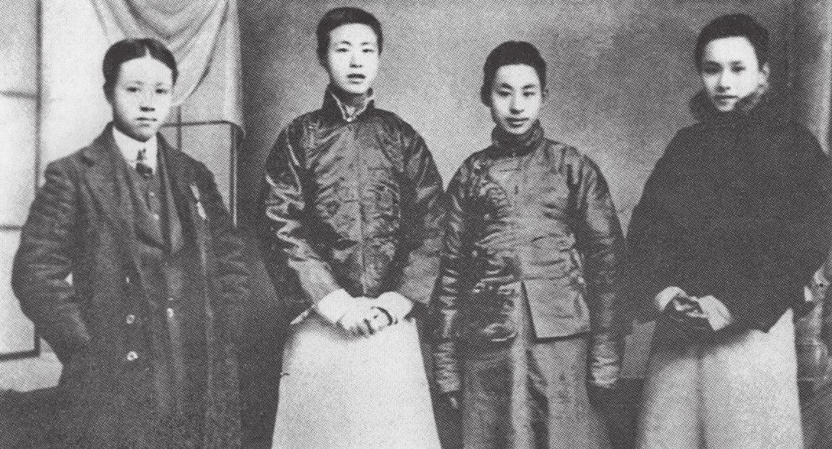 1912年1月,叶圣陶(右二)与同学顾颉刚(左二)、王伯祥(右一)、王彦龙(左一)参加社会党后摄