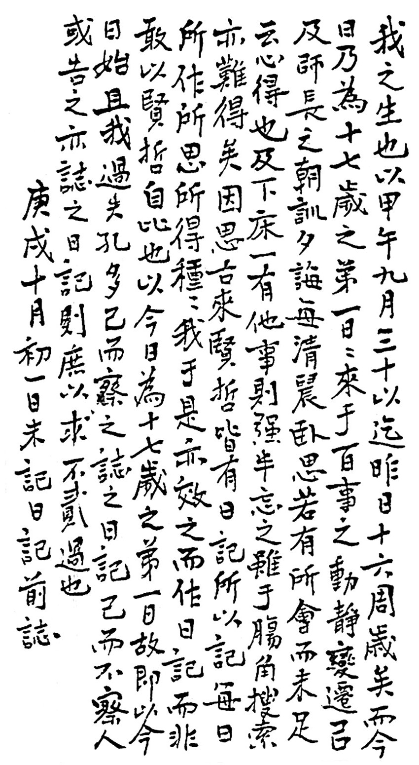 我之生也以甲午九月三十日,以迄昨日,十六周岁矣,而今日为十七岁之第一日。日来于百事之动静变迁,以及师长之朝训夕诲,每清晨卧思,若有所会,而未足云心得也;及下床一有他事,则强半忘之,虽于肠角搜索,亦难得矣。因思古来贤哲皆有日记,所以记每日所作所思所得种种。我于是效之而作日记,而非敢以贤哲自比也。以今日为十七岁之第一日,故即以今日始。且我过失孔多,己而察之,志之日记;己而不察,人或告之,亦志之日记:则庶以求不贰过也。