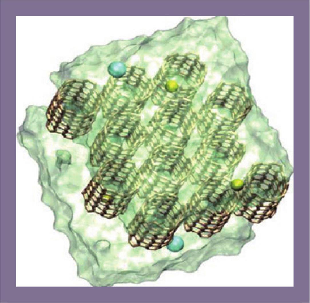 碳纳米管被誉为“纳米之王”,由于其特殊的机械性能、光学性能和电子性能而受到关注。碳纳米管具有规整的孔道结构,有实验研究发现,水可以快速地通过碳纳米管,因此在反渗透中使用碳纳米管膜可以在有效截留离子的前提下,实现比普通膜高数倍的水通过速率。图2.40为碳纳米管通道结构示意图。