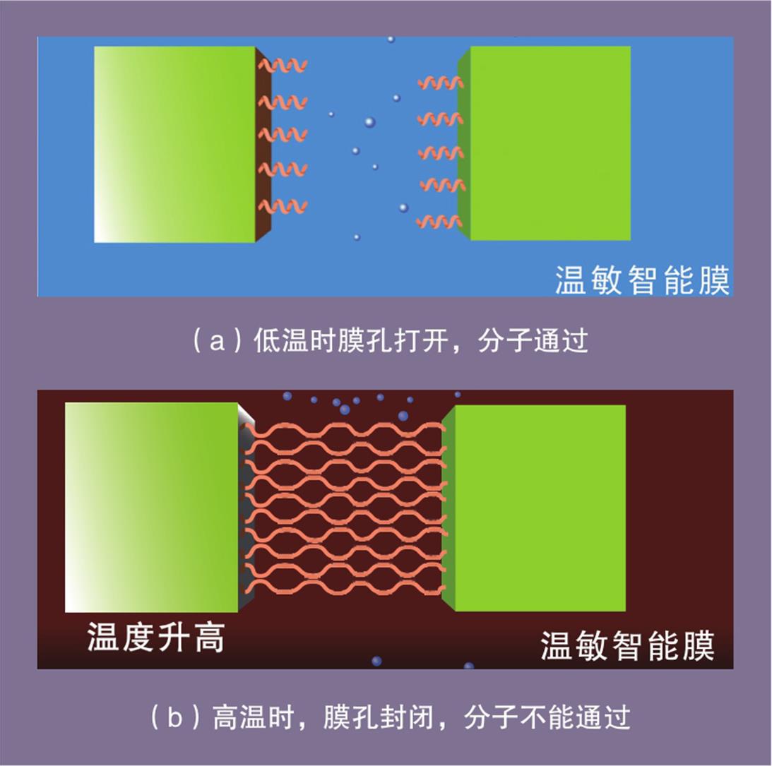 智能膜按照其结构来分类,可以分为开关型和整体型智能膜。开关型智能膜,是将具有环境刺激响应特性的智能高分子材料,固定在多孔基材膜上,使膜孔大小或膜的渗透性可以根据环境信息的变化而改变,起到智能“开关”的作用。整体型智能膜,是将具有环境刺激响应特性的智能高分子材料直接做成的膜。