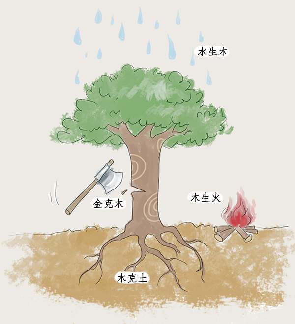 以木为例。树木得到水就生长茂盛,曰水生木;铁的斧头能够把树砍伤砍倒,曰金克木;木柴可使火焰更旺,曰木生火;树木根植于土壤,约束土的行为并从土中汲取养分,曰木克土。