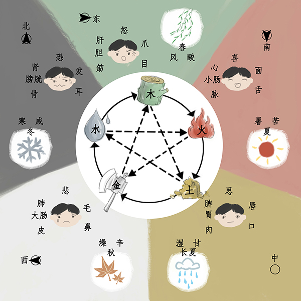 中医的五行学说是以五行之特性,说明五脏(肝、心、脾、肺、肾)的主要功能,形成了以五脏为主体,外应五方(东、南、中、西、北)、五季(春、夏、长夏、秋、冬)、五气(风、暑、湿、燥、寒),内联五官(目、舌、口、鼻、耳)、形体(筋、脉、肉、皮、骨)、情志(怒、喜、思、悲、恐)等的功能系统,也说明了人体的内环境与外在自然界之间的统一和联系。