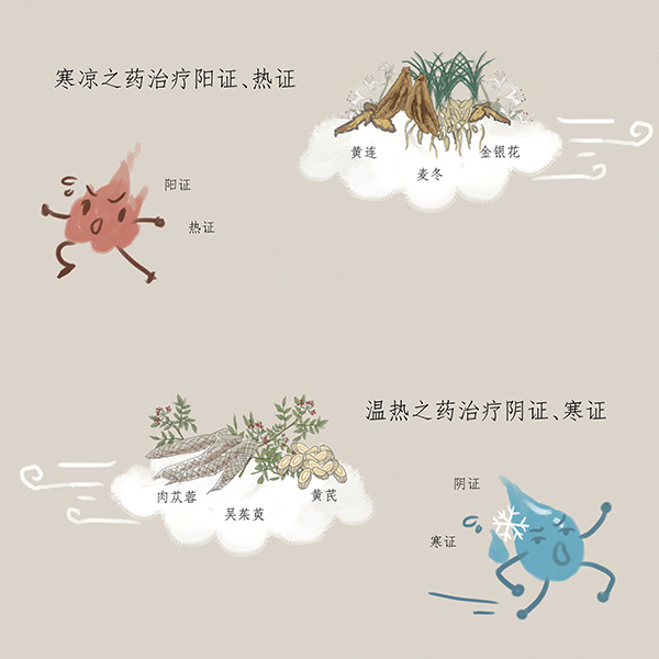 能够减轻或消除热证的药物,一般属于寒性或凉性;能够减轻或消除寒证的药物,一般属于热性或温性。寒凉药用治阳热证,温热药用治阴寒证,是临床必需遵循的基本用药规则。