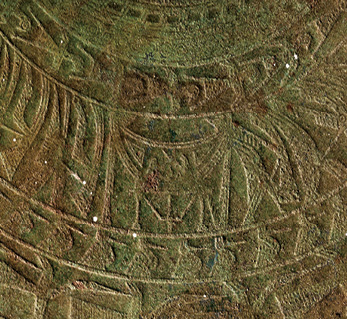 鼓面中心太阳纹12芒,芒间饰翎眼纹。2、3弦分晕,共14晕:第1、6、12晕圆圈圆点纹,第2、7晕栉纹,第3、11晕鸟纹,第4、5、9、10晕复线菱形纹、鸟纹,第8晕上下水波纹夹谷粒纹,第13晕谷粒纹,第14晕光素。边缘饰稻穗纹。鼓沿逆时针环立双蛙累蹲塑像4组。缘外伸3厘米。鼓胸2、3弦分晕,共5晕:第1晕复线菱形纹,第2晕圆圈圆点纹,第3晕栉纹,第4晕上下水波纹夹谷粒纹,第5晕大部光素。一侧鼓耳、两侧鼓胸第5晕鼓耳两侧各有一古体老挝文印章(中文意思为“大”),两侧各有1条变色龙(变色龙与雨水有关,变色龙出现频繁,则旱)。鼓腰2、3弦分晕,共8晕:第1、7晕上下水波纹夹谷粒纹;第2、6晕栉纹;第3、5晕圆圈圆点纹;第4晕光素;第8晕上部位谷粒纹、叶脉纹,本晕一侧鼓耳下饰2棵稻株,每稻株根底各立1只田螺塑像,2棵稻株之间自上而下立蝉1只,下行大象2只。鼓足2、3弦分晕,共4晕:第1晕圆圈圆点纹,第2晕栉纹,第3晕复线菱形纹,第4晕弦纹。胸部叉根扁耳两对,饰复线菱形纹、弦纹、稻穗纹。对称假合范线2道。