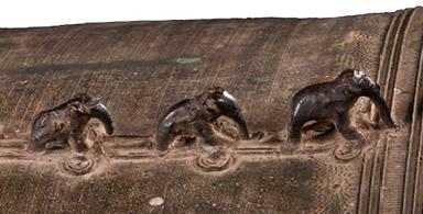 黑格尔Ⅲ型铜鼓共有69面。其中,39面原藏琅勃拉邦王宫,现藏琅勃拉邦博物馆;23面原藏香通王宫,现藏琅勃拉邦博物馆;3面收集自南塔省(Namtha)万普卡县(Viangphoukha)克木人家,现藏南塔博物馆;3面出土于沙湾拿吉省,现藏老挝国家博物馆;1面原为占巴色王宫旧藏,现藏占巴色省博物馆。器型与中国西盟型铜鼓比较相似,但纹饰具有浓郁的地方和民族特色,如老挝黑格尔Ⅲ型铜鼓上常见有大象、田螺、稻株、蝉、变色龙、鬼针草等立体塑像,这反映了老挝稻作文化的地方和民族特点。大象是热带雨林地区常见的动物,从前老挝先民还有“象耕”;变色龙可预测雨水,若变色龙出现频繁,则可能会天旱;鬼针草是常见于稻田旁的植物,雨季以来,便疯长不止;至于田螺、蝉等都是稻田和树上常见的动物。越南学者普遍认为,黑格尔Ⅲ型铜鼓的年代是5世纪