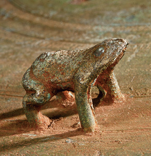 鼓面纹饰模糊不清,中心现可辨2弦分晕,共6晕:第1晕栉纹,第2、3晕切线圆圈纹,第4晕鸟纹,第5、6晕模糊不清。鼓沿逆时针环立青蛙4只,边缘外伸1.3厘米。鼓胸1、3弦分晕,共5晕:第1、4晕栉纹,第2、3晕圆圈圆点纹,第5晕光素。鼓腰1弦分晕,共3晕:第1、3晕栉纹,第2晕圆圈圆点纹。腰足之际凸起一圈凸棱。鼓足1弦分晕,共4晕:第1、3晕栉纹,第2晕圆圈圆点纹,第4晕角形纹。胸腰间有扁耳两对,耳中部开一长方形孔,耳面光素。假合范线2道,鼓面有少量垫片痕。