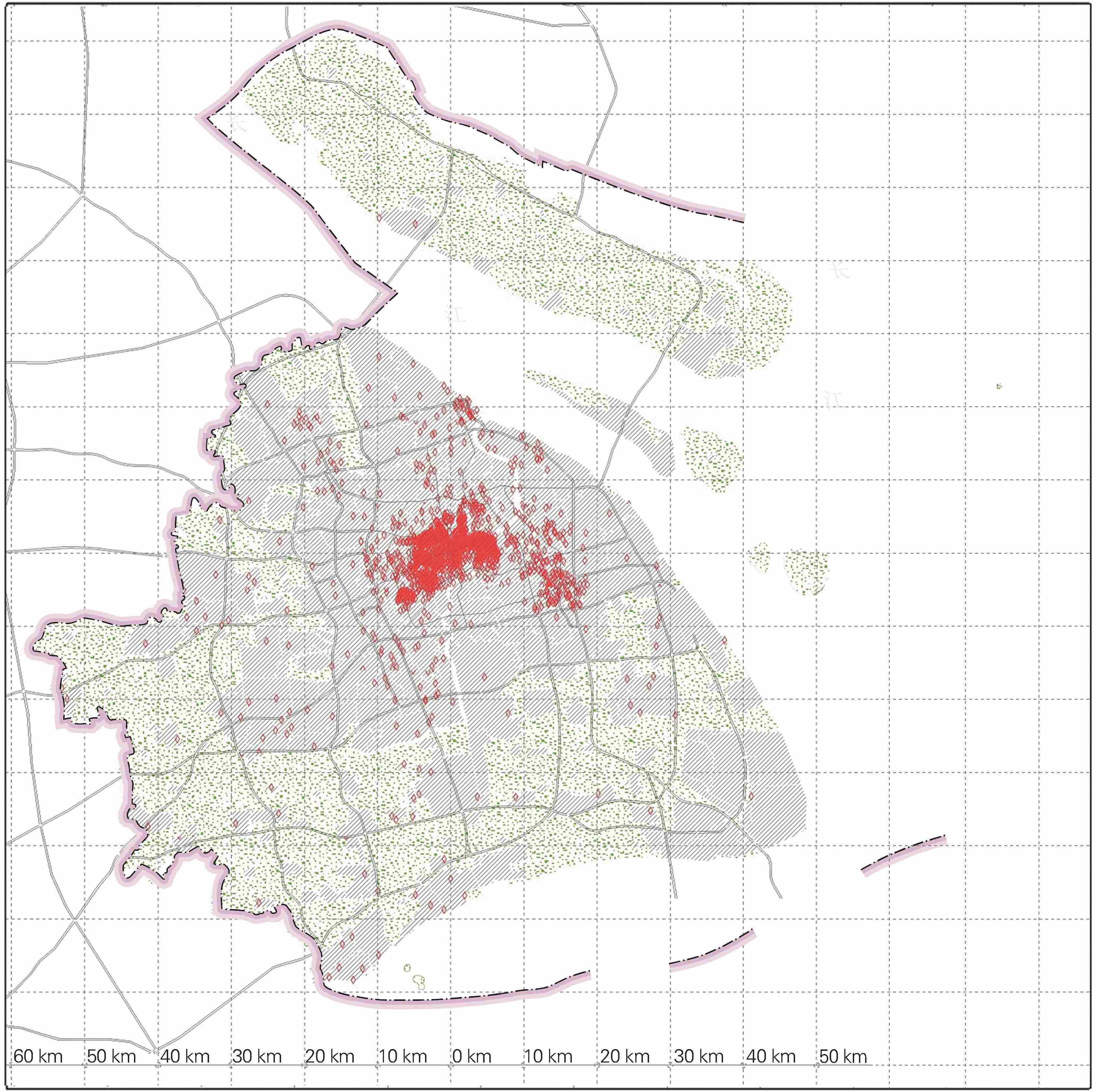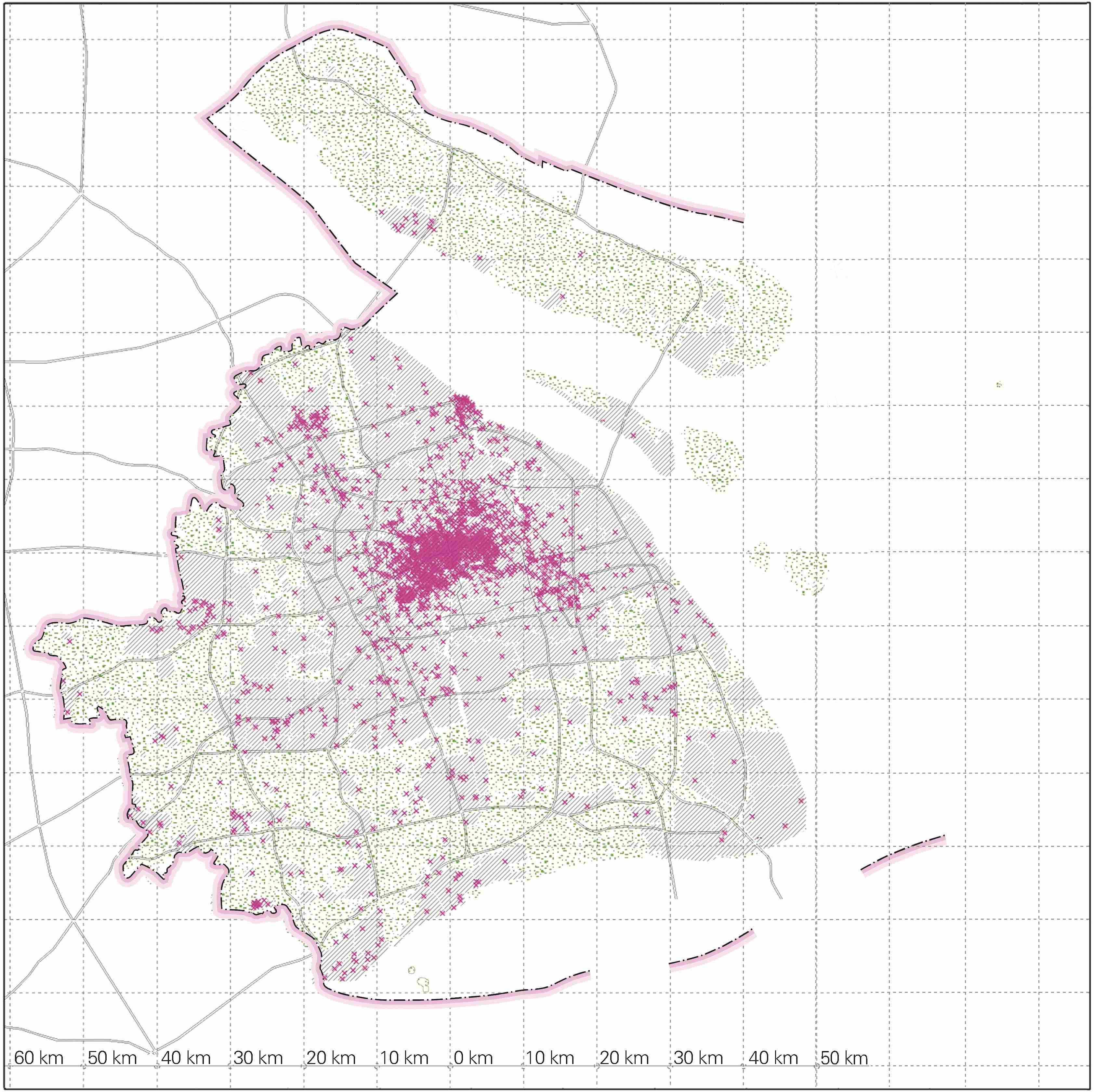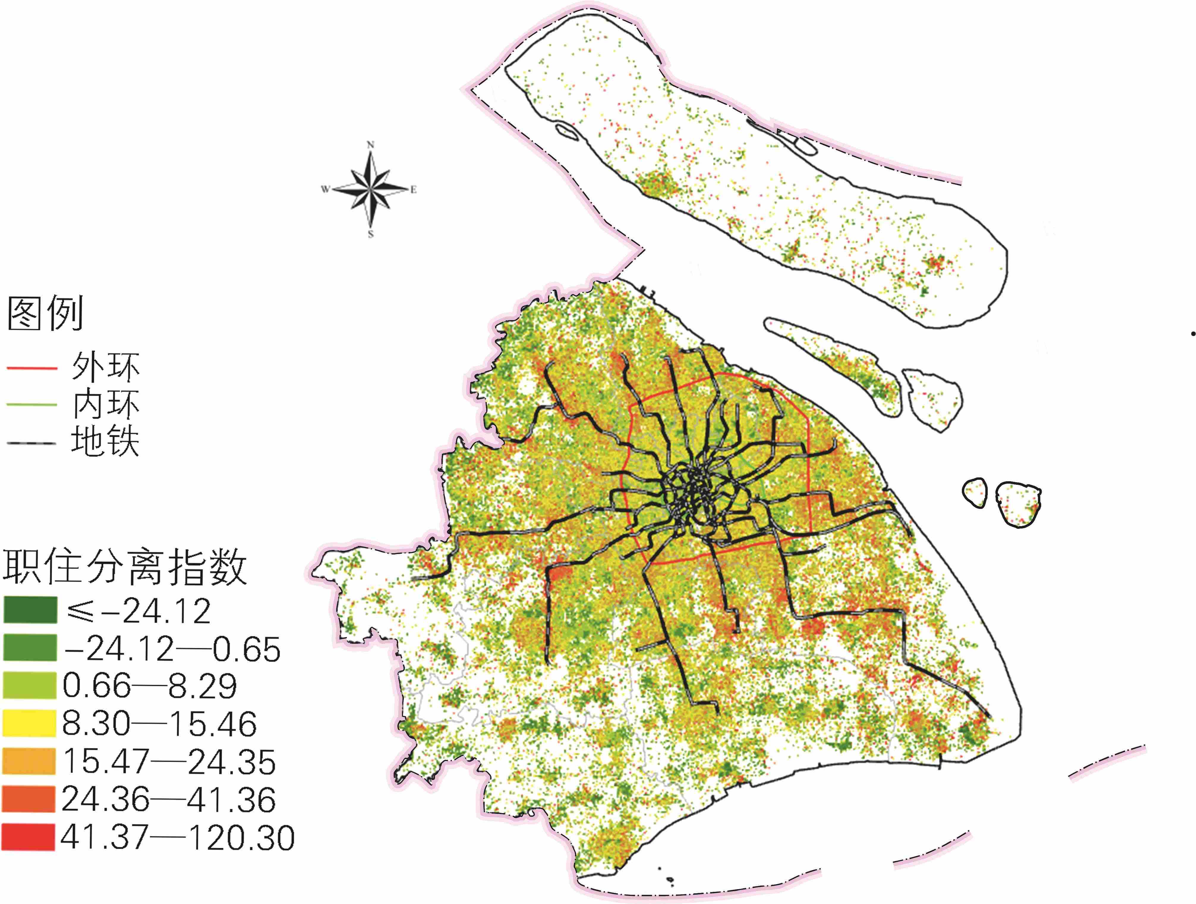 我们利用上海居民从居住地到工作地的通勤数据,计算了每个250米边长网格的职住分离指数。