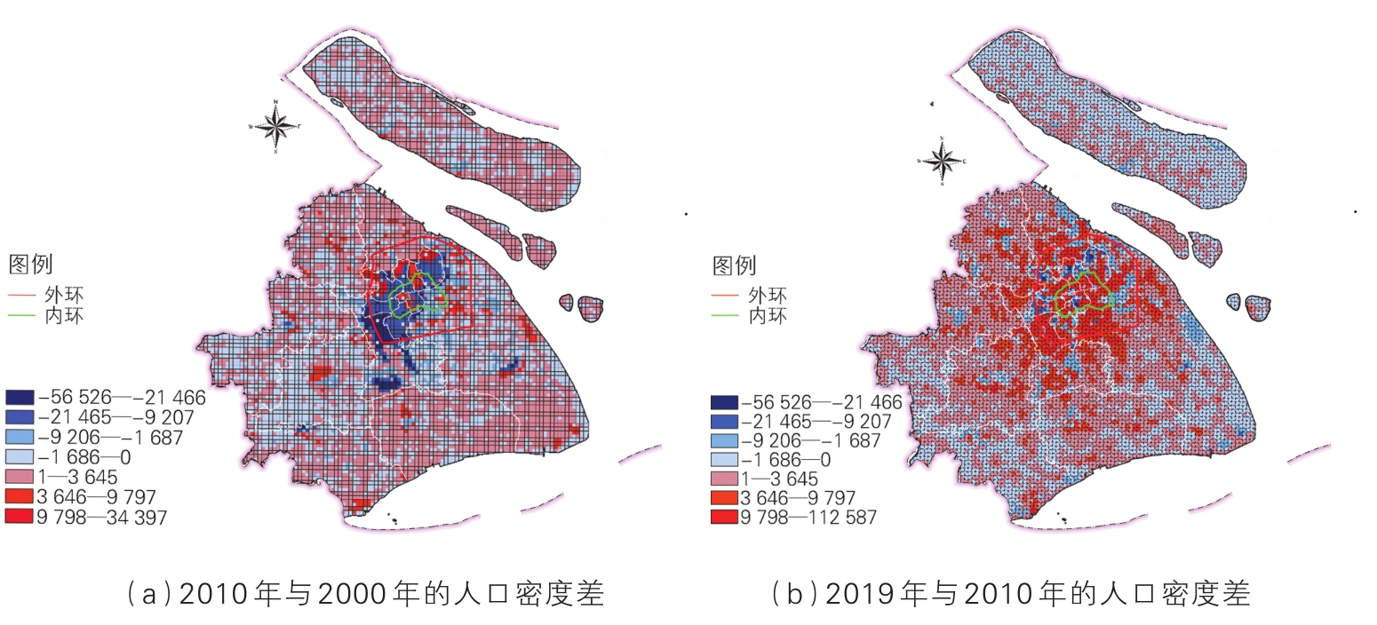 那么,随着时间的推移,既然已经有大量新增服务业就业岗位集中在市中心,那么,上海有没有像其他国际大都市那样出现人口回到市中心的现象呢?图1.11展示了2000—2010年、2010—2019年1公里网格人口密度变化空间分布情况。从中可以看出,2000—2010年市中心大部分地方均呈现人口密度大幅度下降态势,尤其是外环内浦西的大部分地区,下降幅度最大。但在2010—2019年的10年间,市中心人口密度下降趋势逆转,呈现出向中心集聚的态势,内环内各区域的人口密度几乎都在上升,而且人口密度增长幅度较大的地区也集中在内环线以内。在更大范围的外环线以内,人口密度也有大幅度提升。