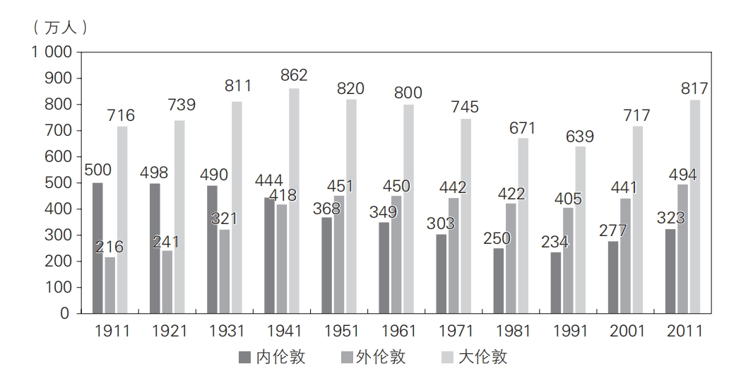 图1.7 不同圈层的伦敦人口(1911—2011)