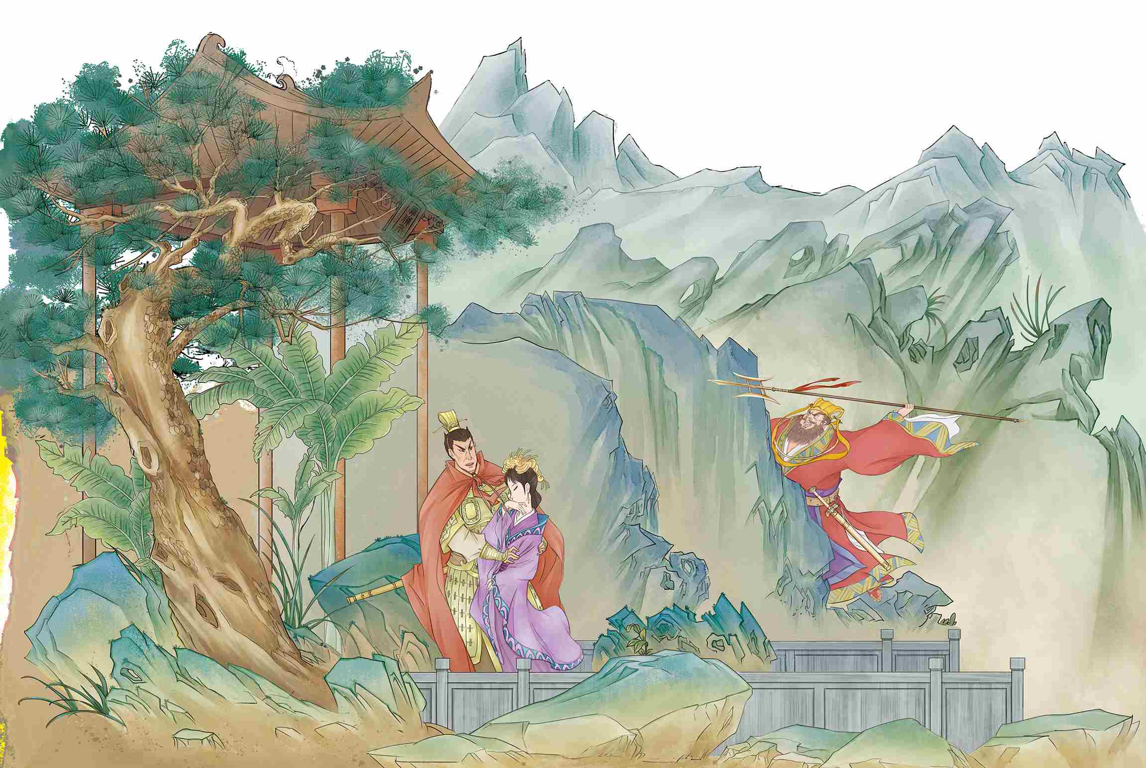 司徒王允想要除掉董卓,却束手无策,偶然见到府中的歌舞伎貂蝉貌若天仙,王允便心生一道连环计,对貂蝉细说计策。貂蝉答道:“大人对我恩重如山,此事我万死不辞。”次日,王允设计将吕布引到府中做客,有意让貂蝉敬酒。吕布立刻被貂蝉迷得目不转睛,王允趁势说道:“这是小女貂蝉,愿送与将军为妾。”吕布欢喜无限,再三拜谢而去。过了数日,王允又请董卓来府上赴宴,董卓见到貂蝉也是垂涎三尺,王允当即将貂蝉送至董卓府上。吕布得知此事,前来质问王允。王允道:“董太师接走小女,说要为将军主婚,我岂能拒绝?”吕布转怒为喜,回去等了又等,却不见董卓为他主婚,才知道董卓早已将貂蝉占为己有。吕布大怒,在凤仪亭找到貂蝉,貂蝉哭道:“妾原想服侍将军,却被董卓玷污,一直忍辱偷生,今日愿以死明志。”说罢作势要跳荷花池自尽。吕布慌忙拦住,心碎不已,怒道:“今生若不能娶你,非英雄也!”董卓忽然回来,正撞见吕布扯住貂蝉说话,勃然大怒,抄起吕布的方天画戟掷了过去,吕布慌忙躲开,掉头逃走。李儒拦住董卓劝道:“吕布之勇冠绝天下,何苦为一女子与他翻脸?若将貂蝉赐予吕布,吕布必然竭力效忠。”董卓道:“你说得也是。”董卓回到内室,对貂蝉道:“将你赐予吕布,如何?”貂蝉哭道:“妾已侍奉贵人,怎能再送家奴!这定是李儒的诡计,他与吕布交好,全然不顾太师的体面和贱妾的性命!”说罢拔出宝剑就要自刎。董卓连忙拦住貂蝉,从此打消了送走貂蝉的念头。