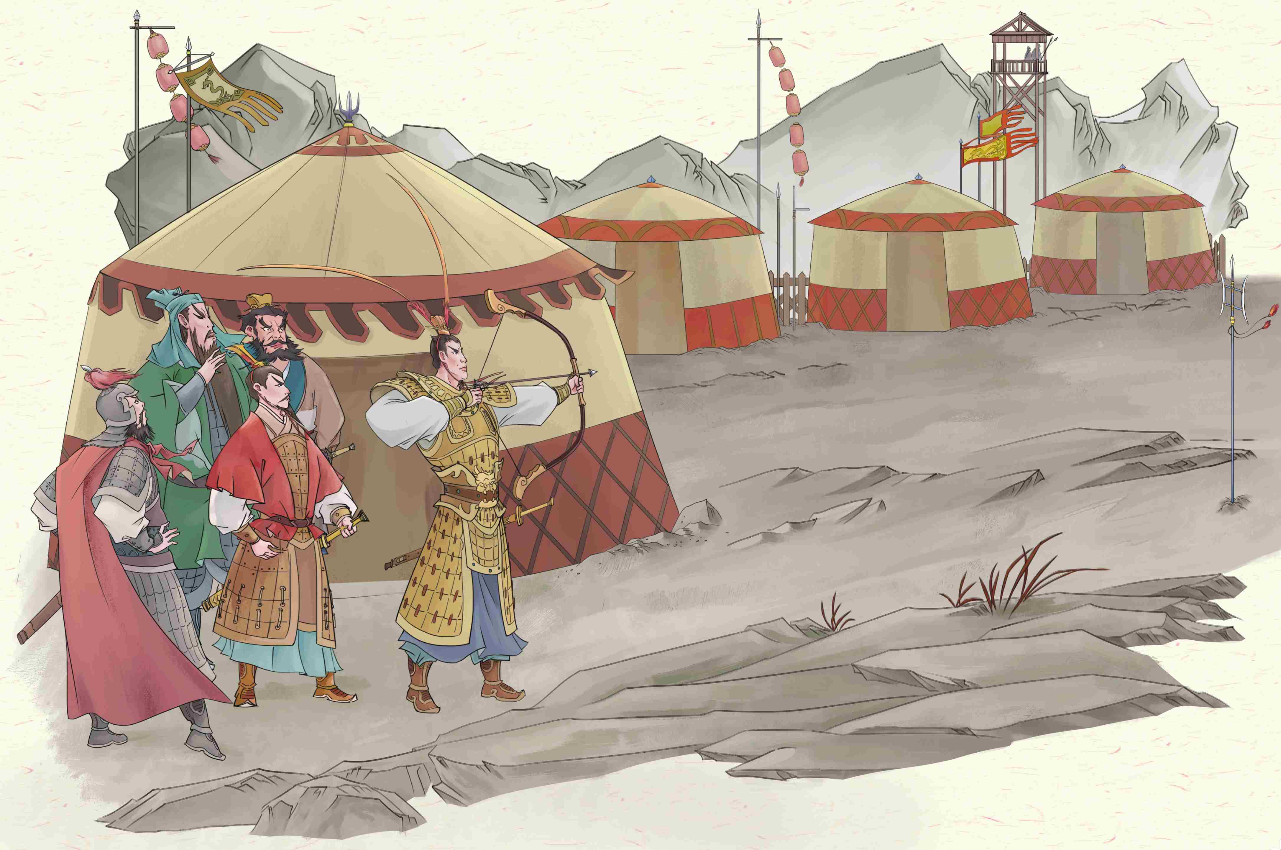 袁术命纪灵为将征讨刘备,又送吕布粮草使其按兵不动。吕布心想:“刘备驻小沛对我并无威胁。袁术吞并刘备,我却难免唇亡齿寒。”因此不愿去杀刘备,可也不愿与袁术结仇,便约了纪灵与刘备到辕门,为两家和解。吕布将方天画戟立在辕门外一百五十步,对众人说道:“若我射中戟上小枝,你二人就此罢兵。如射不中,你们任意厮杀,我不再管。谁不从我,我便与另一家合力杀之!”说罢挽开袍袖,拉弓搭箭,一箭正中戟上小枝。