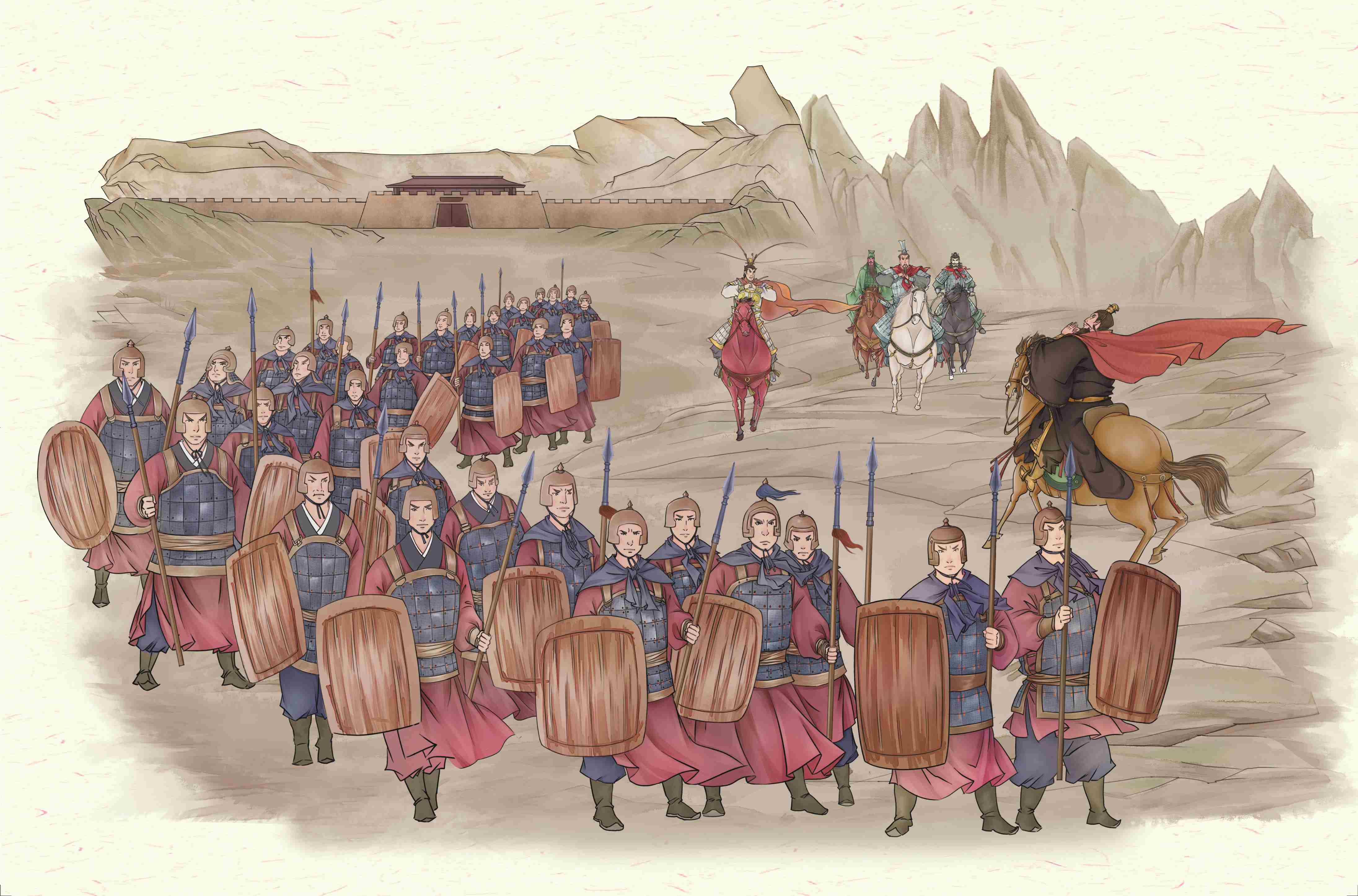 话说孙策想要离开袁术,回江东发展势力。为了向袁术借兵,孙策将父亲孙坚留下的玉玺拱手相送。袁术得了玉玺,野心倍增,在淮南称帝,加封文臣武将,做起了皇帝。袁术公然谋反,曹操亲率十七万大军,联合江东孙策、豫州刘备、徐州吕布攻打袁术。曹操的军队每天都要消耗大量粮食,眼下又是荒年,粮食接济不上,眼看着军粮将尽,军心浮动,曹操只好将罪过推到管理军粮的仓官王垕(读hòu)头上,说他贪污军粮,斩首示众。军士们的怨气这才缓解。曹操一鼓作气攻下寿春,收掠一空。正要继续进兵追杀袁术,忽然闻报,张绣在刘表的帮助下逐渐恢复实力。曹操后方不稳,便命孙坚沿江陈兵,使刘表不敢妄动;又让刘备盯紧吕布,自己回师再征张绣。行军途中,正值麦熟之际,曹操下令“践踏麦田者斩”。百姓感恩戴德,军士遵令而行。偏偏有鸟飞过,曹操的马受惊,踏坏一片庄稼。曹操道:“我犯了军法,理应问罪,否则无法服众。”说着拔出宝剑就要自刎,众将连忙劝阻。曹操于是割发代首,以示三军,从此军纪更加严明。