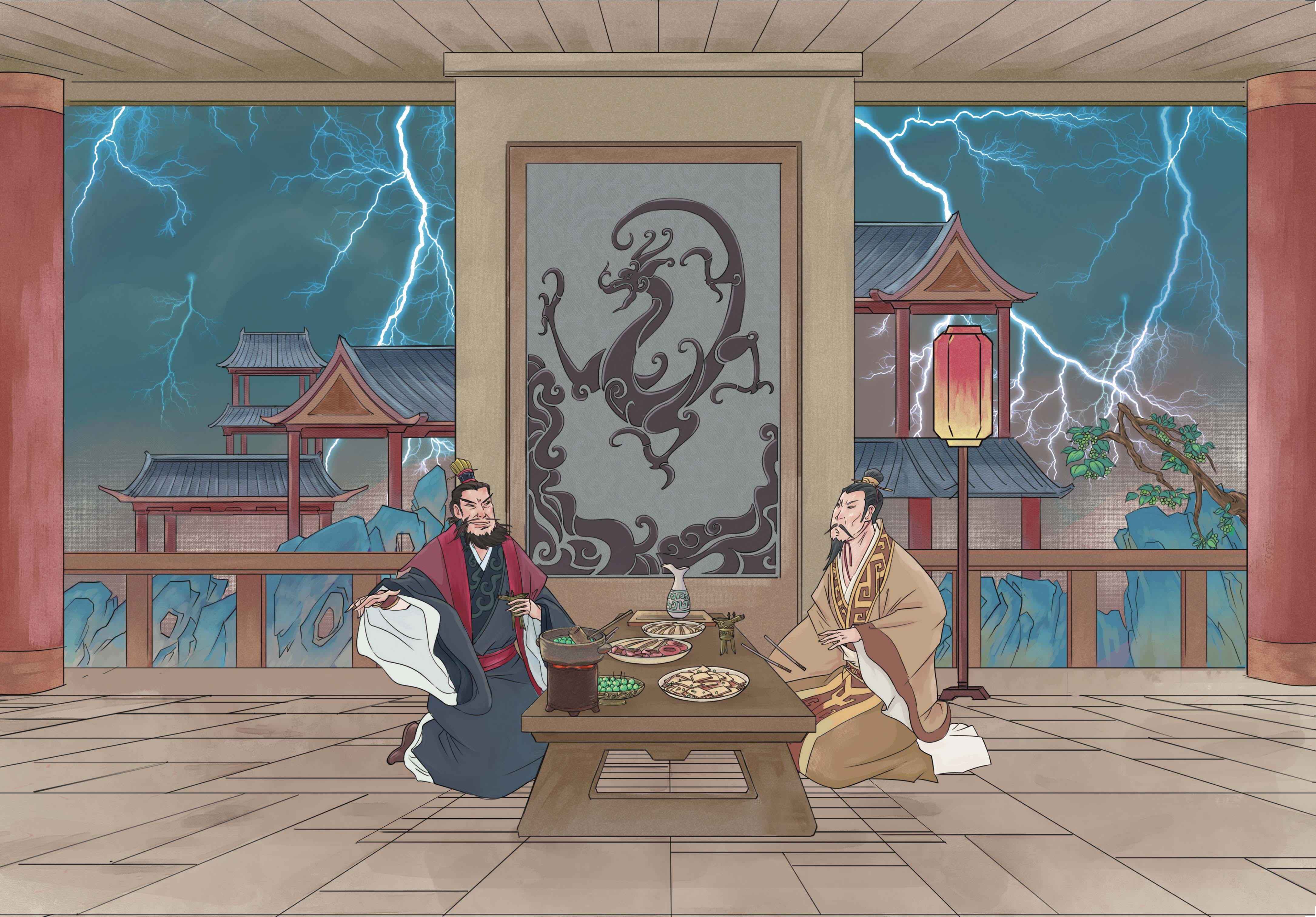 曹操带刘备回许都拜见汉献帝。汉献帝大权旁落,一直忧虑万分,因此拉拢刘备,尊刘备为皇叔,又秘密授予国舅董承一封血诏,命他号召忠君爱国之士推翻曹操、还政于天子。董承奉诏,密约工部侍郎王子服、西凉太守马腾、刘备等人写了义状,立志共讨曹贼。刘备整日小心谨慎,只在后园种菜,不敢招摇。一日,曹操请刘备前去做客,说道:“去年征张绣时,军士们口渴难耐,我心生一计,说前方有梅林。军士听了,加快脚步进军。今见枝头青梅,正好取来煮酒,请玄德共赏。”二人对坐,开怀畅饮。忽见远处天边阴云变幻,像有巨龙吞云吐雾一般。曹操道:“龙,升则飞腾于宇宙之间,隐则潜伏于波涛之内,世间英雄也是如此。玄德久历四方,当知天下英雄,请试言之。”刘备道:“淮南袁术、河北袁绍,四世三公,门生故吏遍天下,可谓英雄?”曹操道:“袁绍色厉胆薄,袁术冢中枯骨,非英雄也。”刘备道:“孙策雄踞江东,可谓英雄?”曹操道:“孙策是借父荫,非英雄也。”刘备道:“刘表、张绣等人如何?”曹操大笑:“碌碌小人,何足挂齿!”笑罢说道:“天下英雄,唯你我二人而已。”刘备大惊,手中的筷子掉落在地。